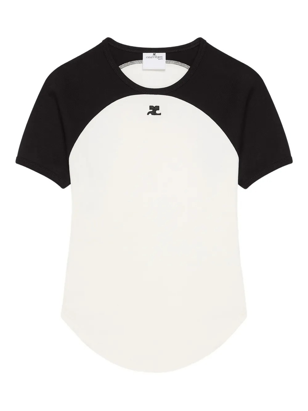Black and white Circle Contrast T-shirt by Courrèges in cotton with a round neckline, short sleeves, logo print on the chest, and curved hem.