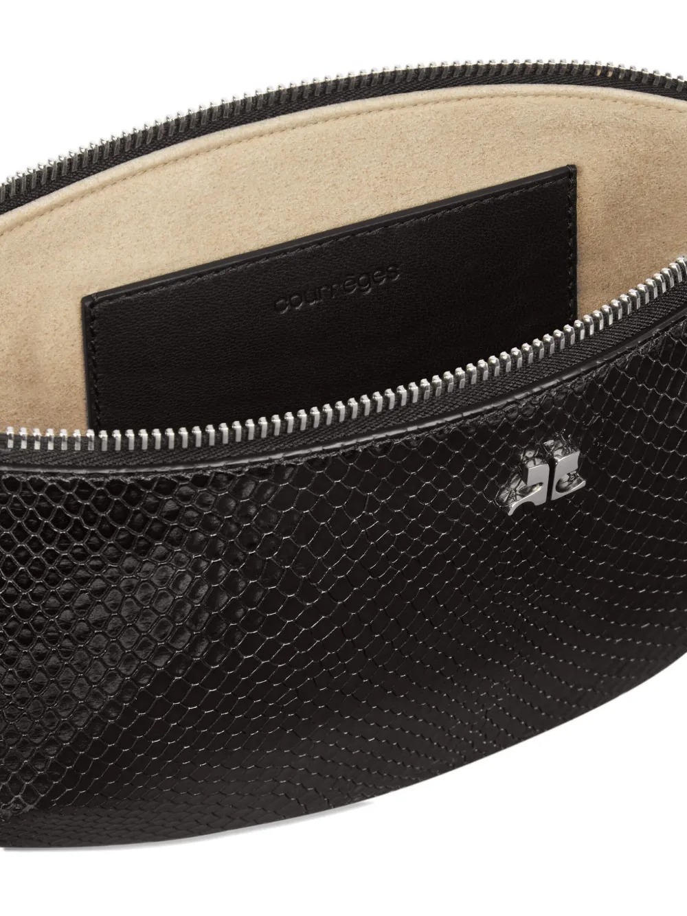 Borsa nera Holy Eclipse Viper di Courrèges in pelle con design in rilievo, tracolla rimovibile, logo goffrato e manico.
