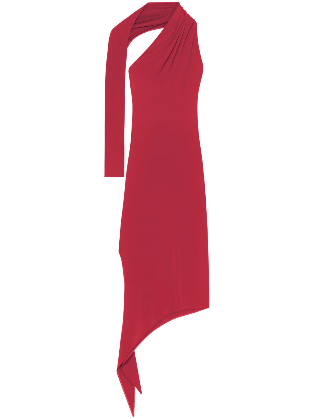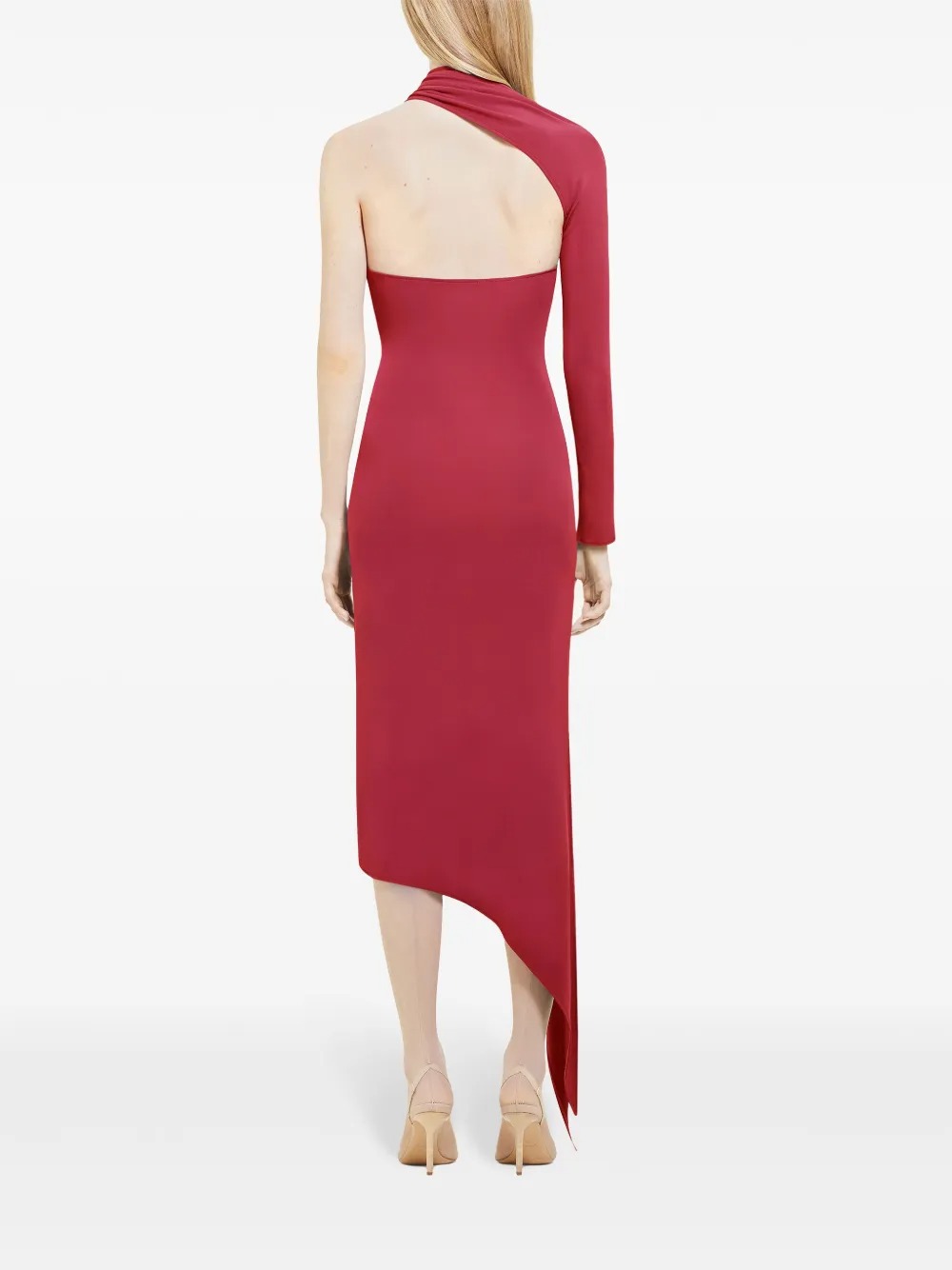Long Slash Crepe dress by Courrèges in viscose with crêpe effect weave, stretch design, asymmetrical neckline, cut-out detail, single long sleeve, opening at the back, and asymmetrical hem.