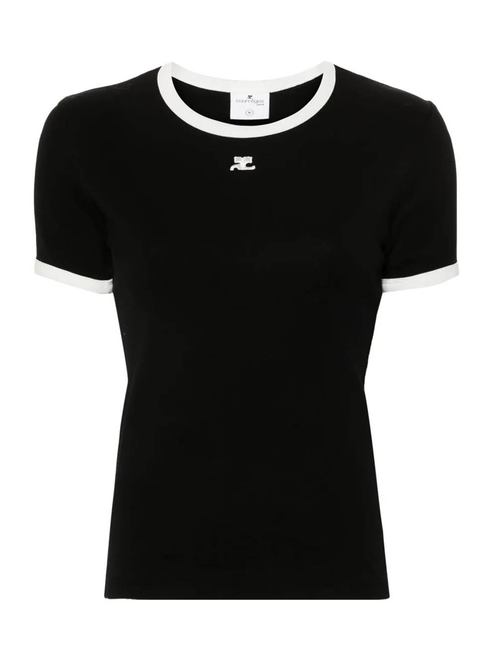Courrèges Signature Contrast black and white cotton T-shirt with logo appliqué on the front, contrasting trim, round neckline, and straight hem