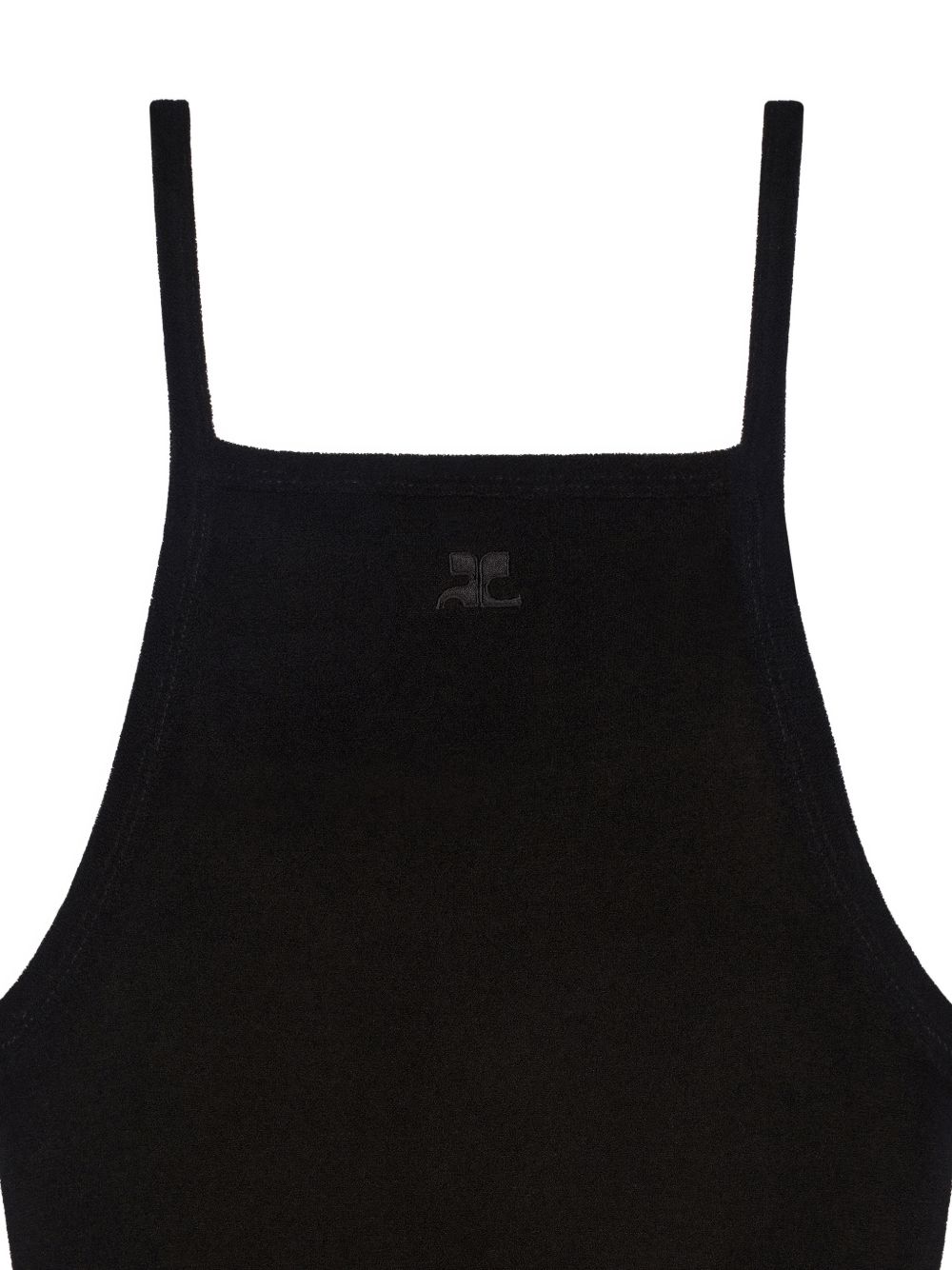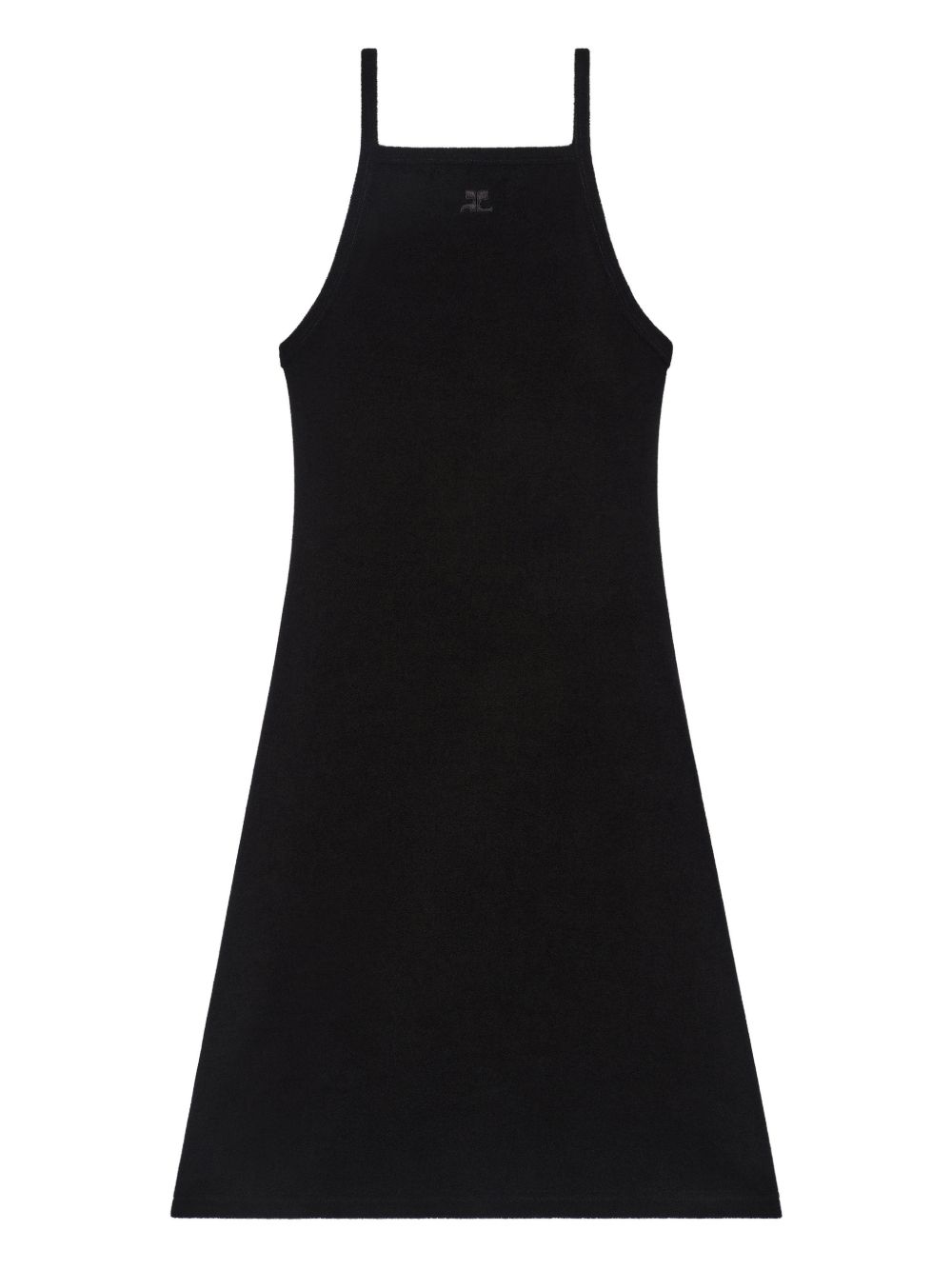 Black Spongy Heritage dress by Courrèges, made of viscose with an embroidered logo, sleeveless, with a square neckline and thin straps.