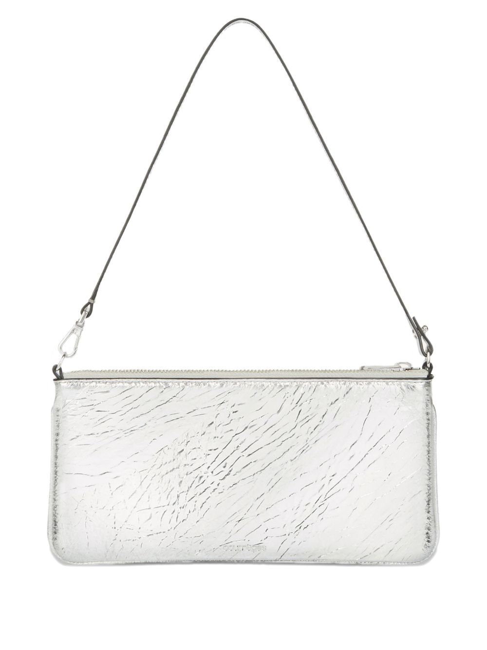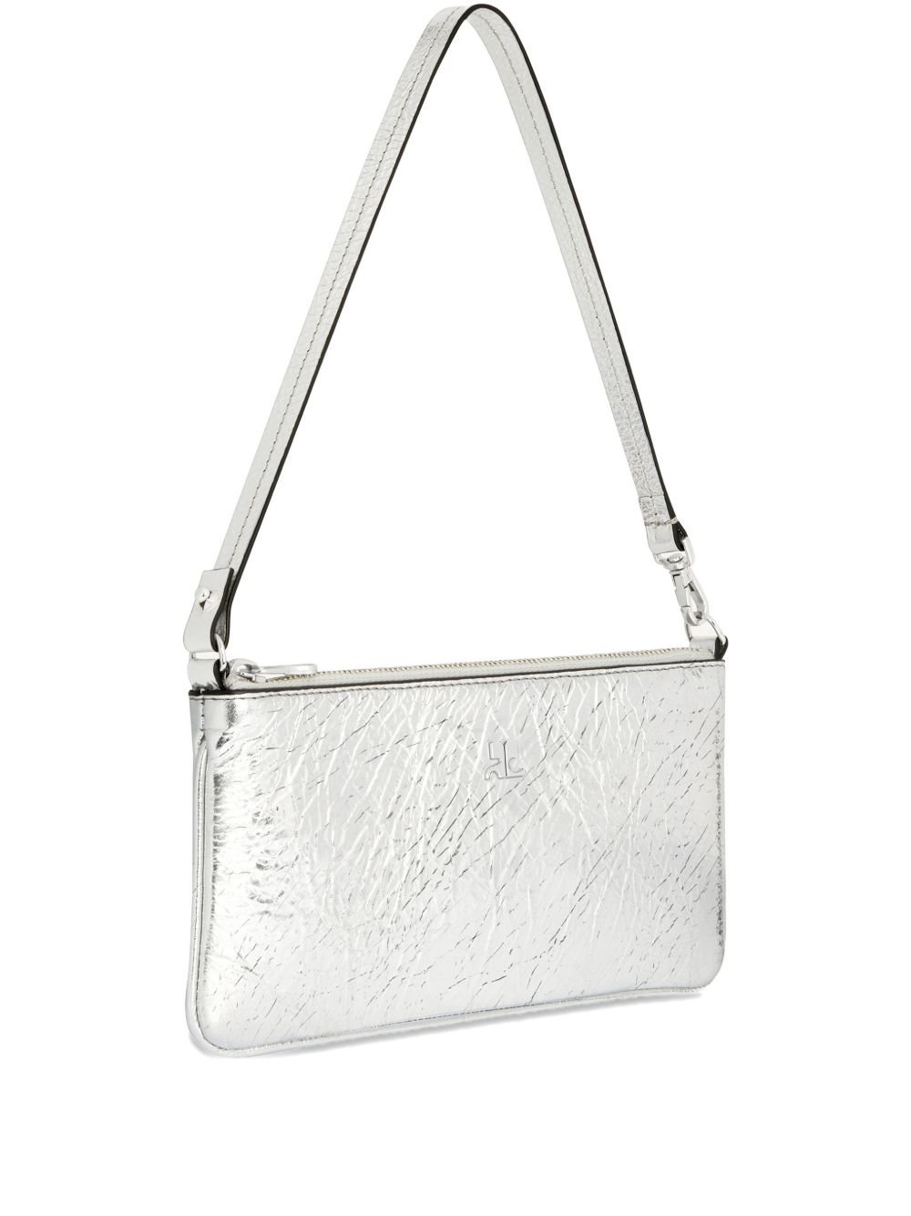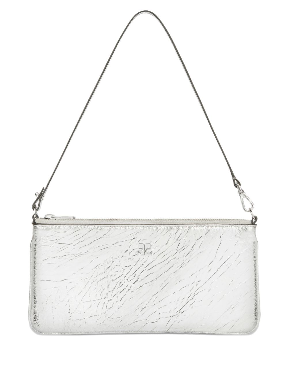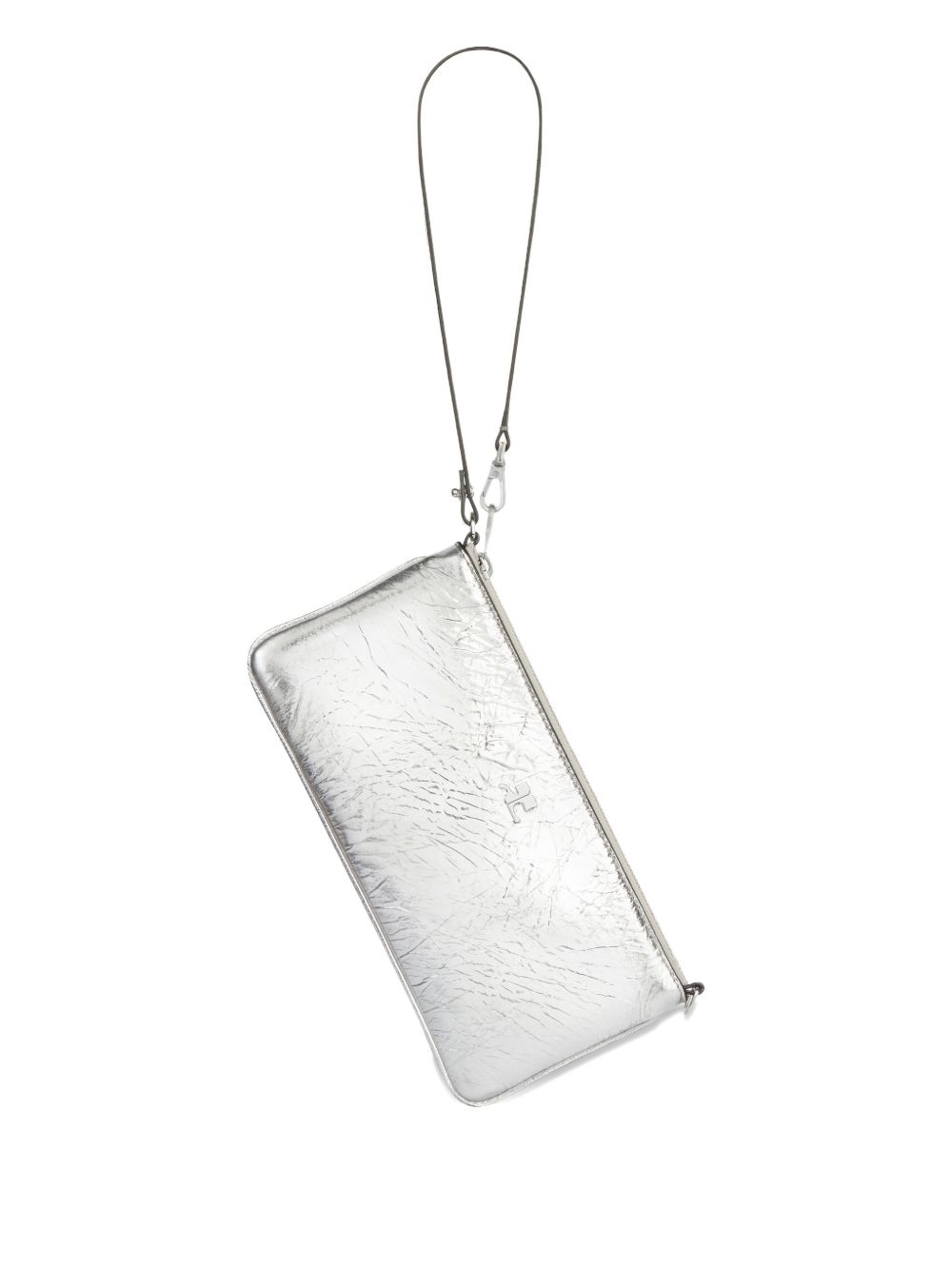 Courrèges Argeto Zipped Naplack Pouch in split cowhide leather, with a zip closure, removable shoulder strap, silver-tone details, and a logo plaque.