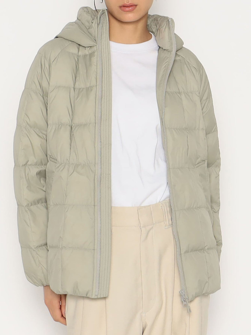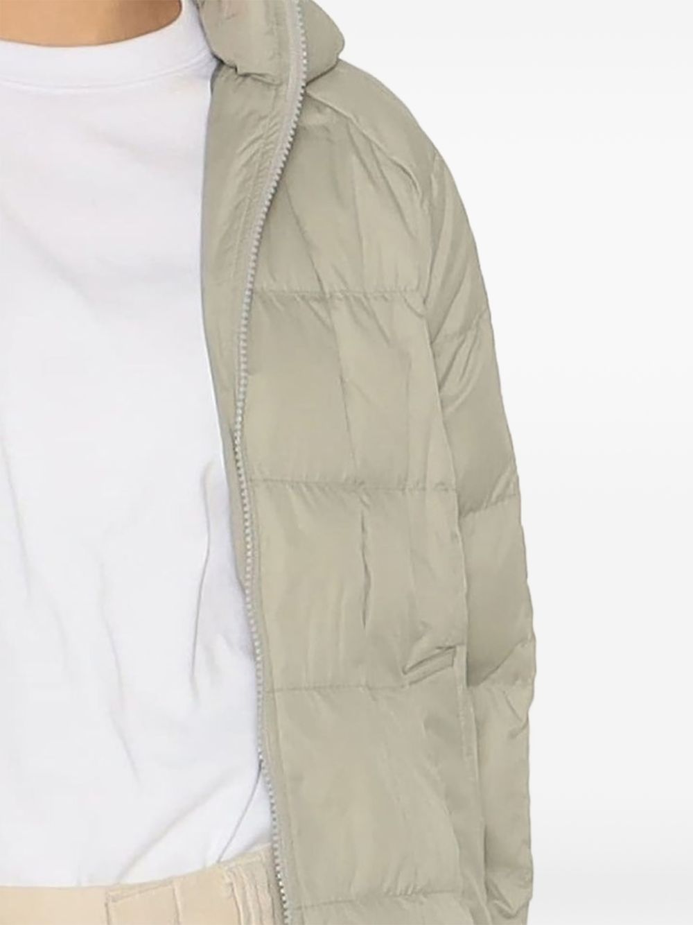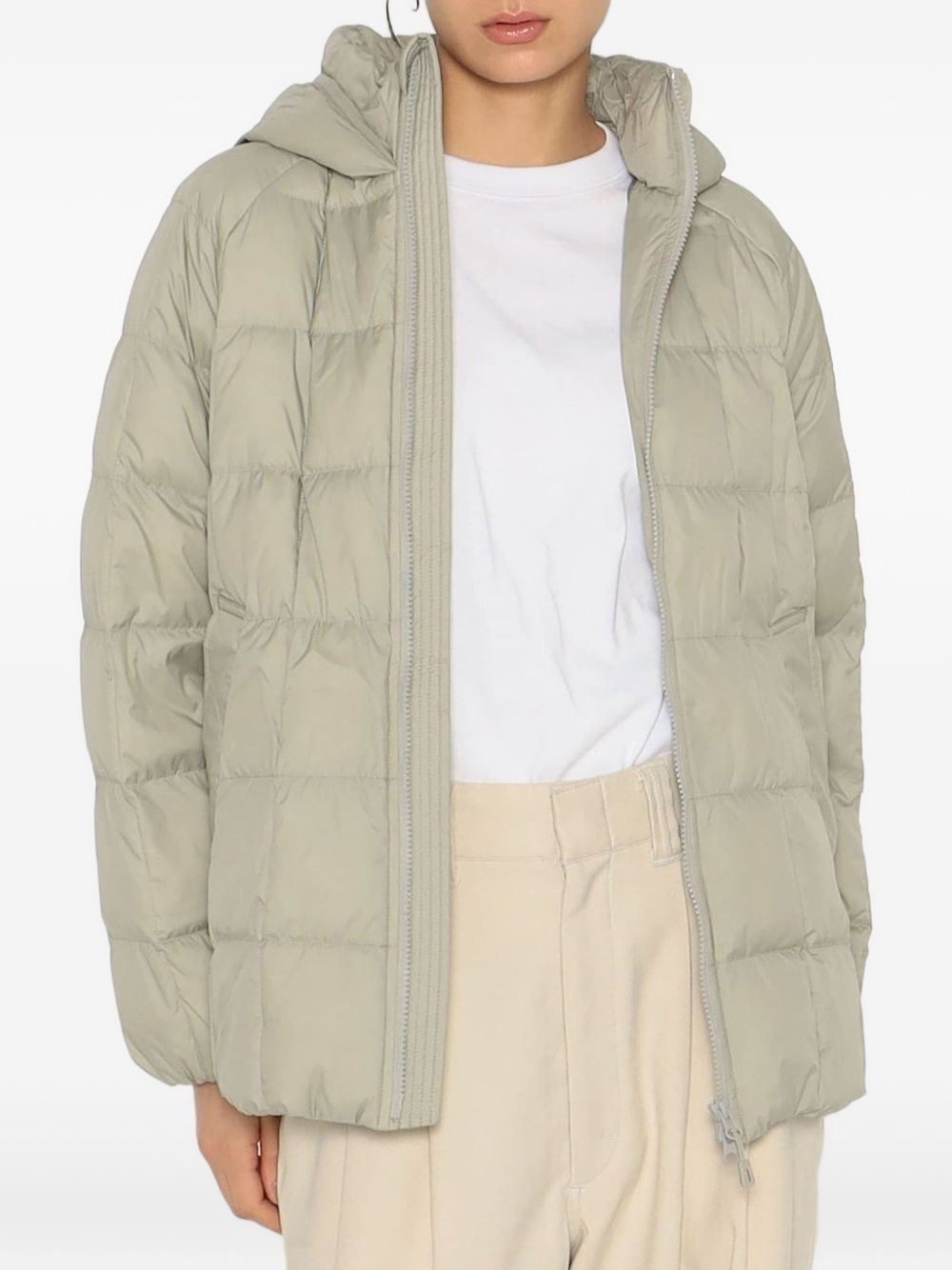 Danton Square Quilted Down Nylon Taffeta Padded Jacket in nylon with hood, front zip closure, and side zip pockets.