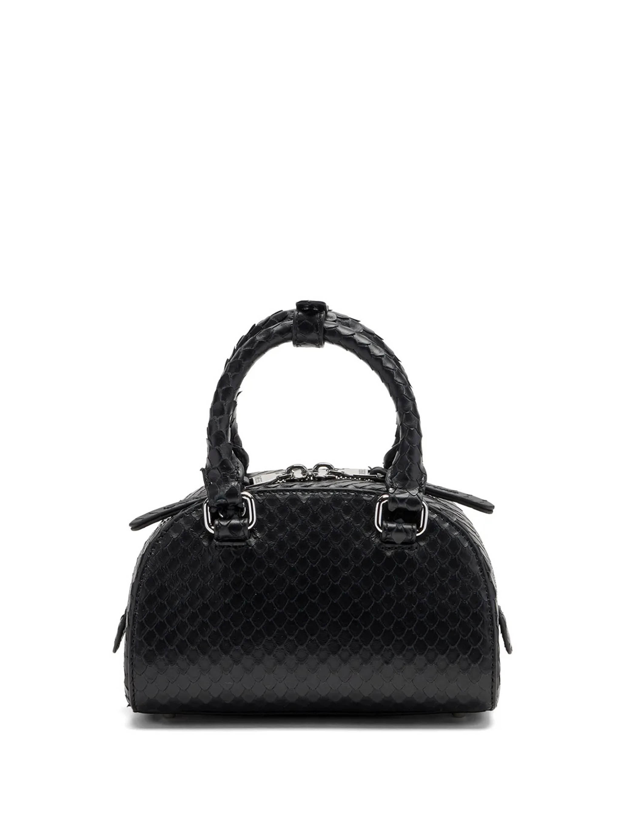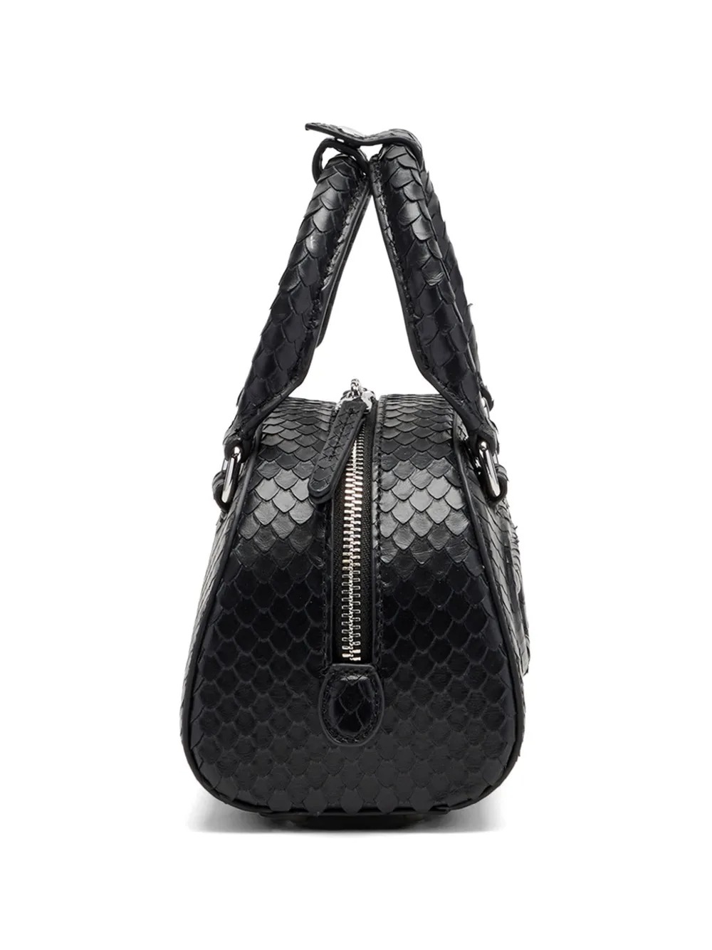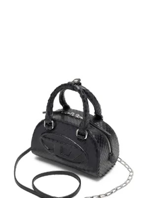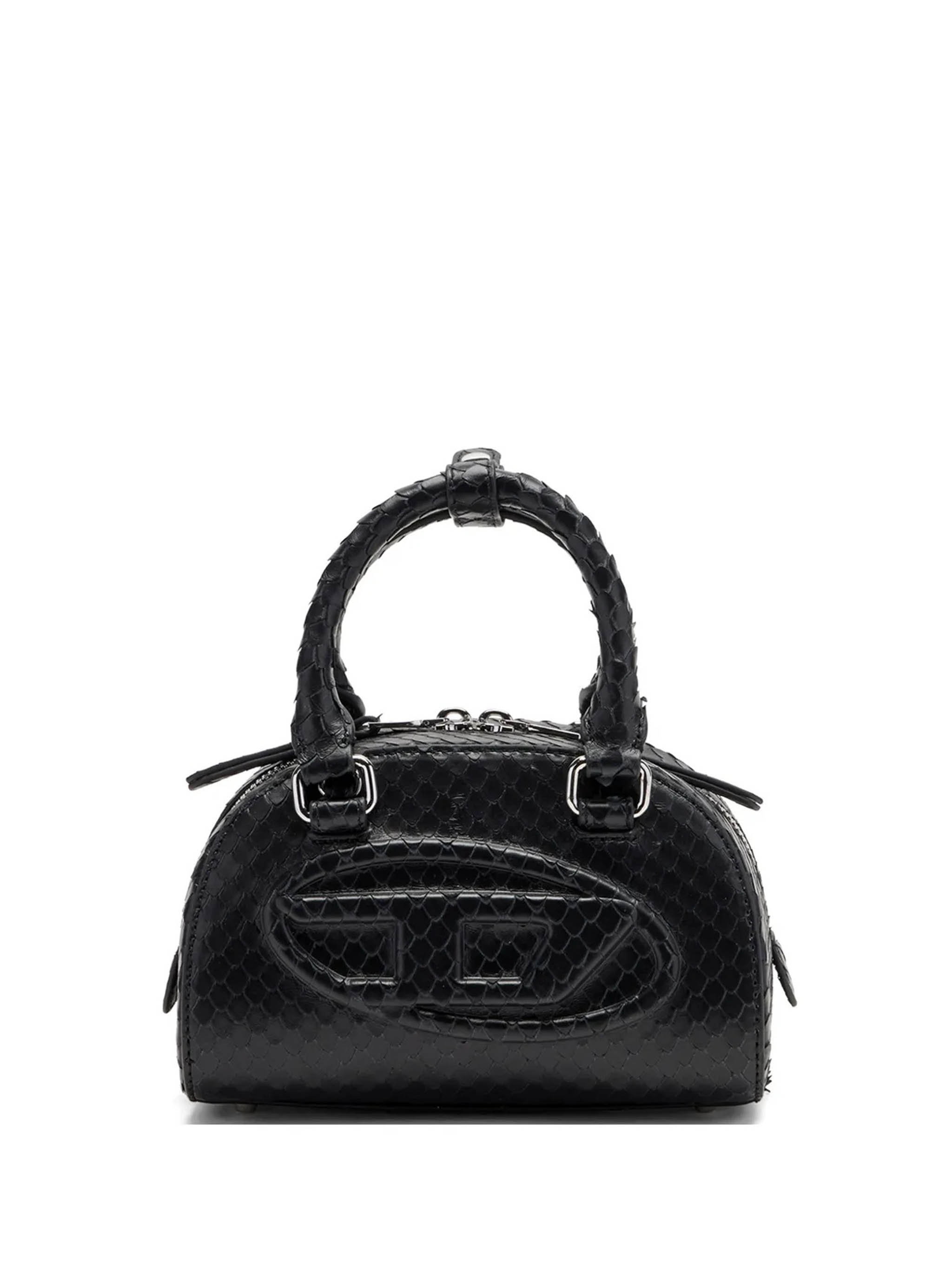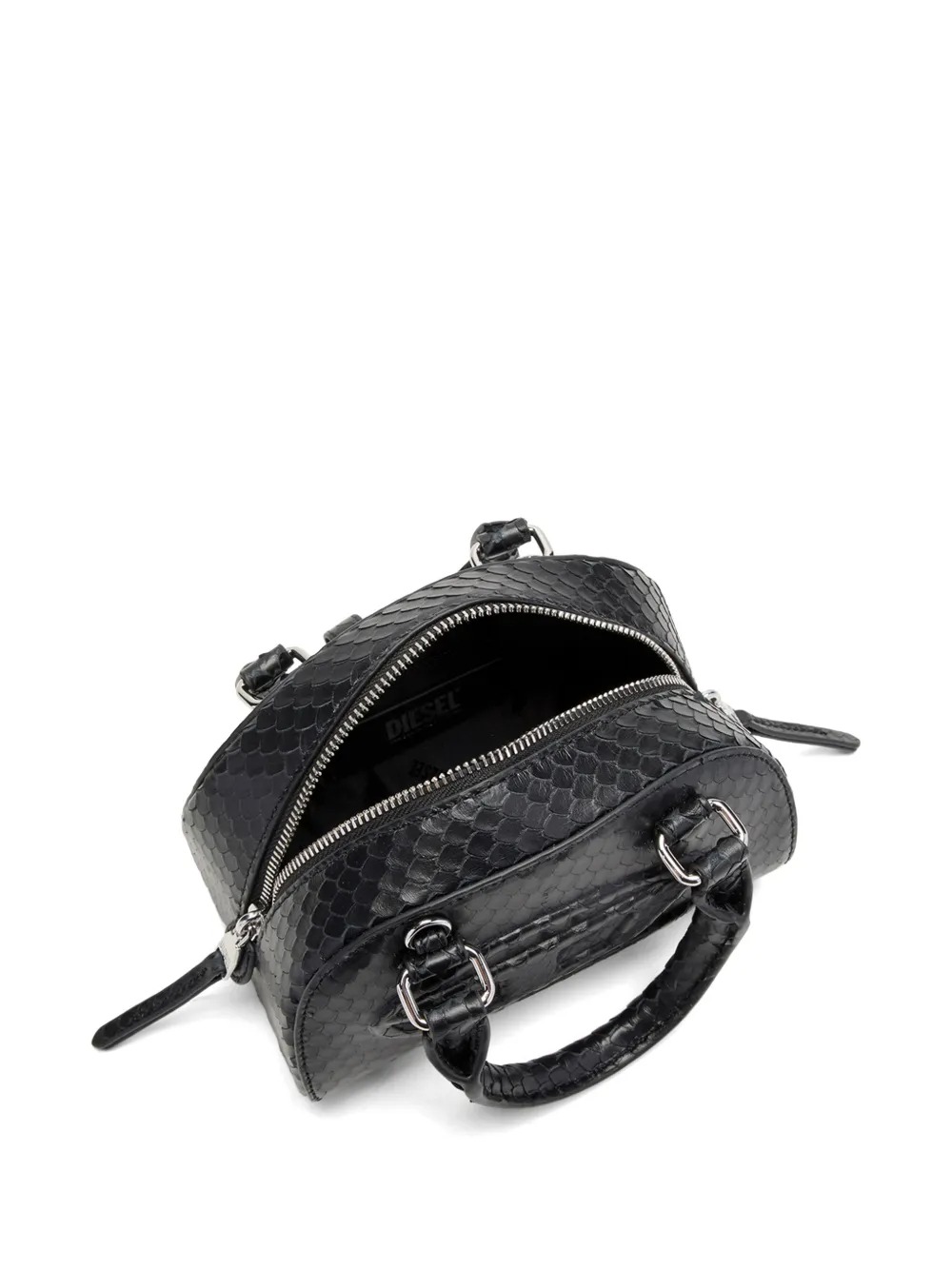 Diesel Dome Mini 1-compartment black leather bag with embossed finish, signature Oval-D plaque, two round handles, double-slider zipper closure, removable shoulder strap, single compartment, and silver-tone details.