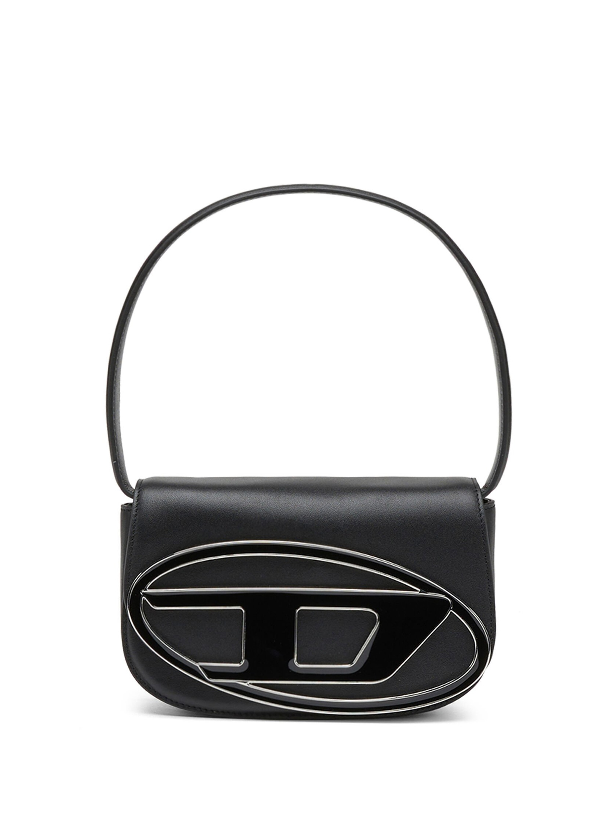 Black 1DR shoulder bag by Diesel in leather with handle, magnetic flap, removable shoulder strap, and metal "D" logo plaque.