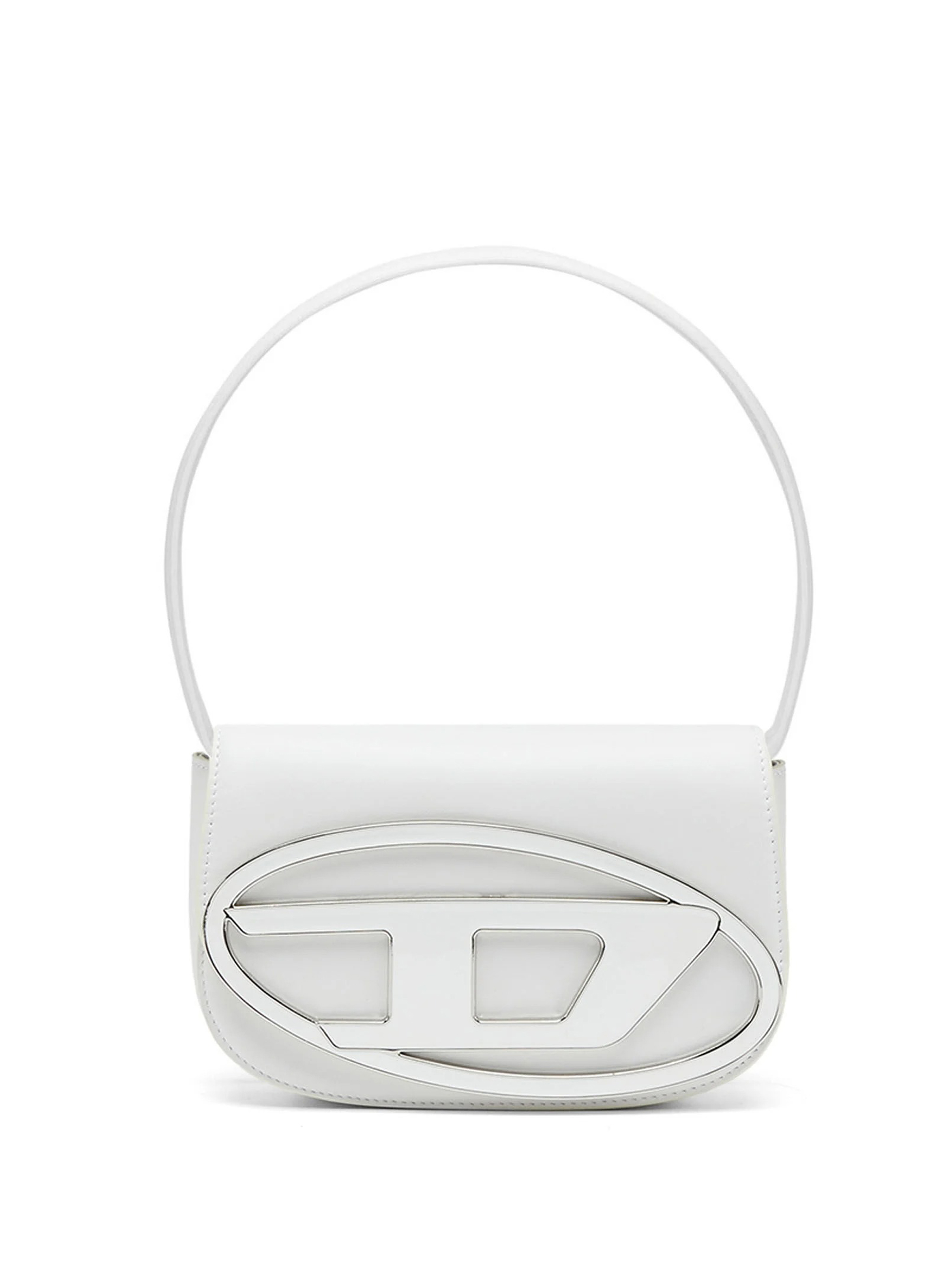 White 1DR leather shoulder bag by Diesel with handle, magnetic flap, removable shoulder strap and metal "D" logo plaque .