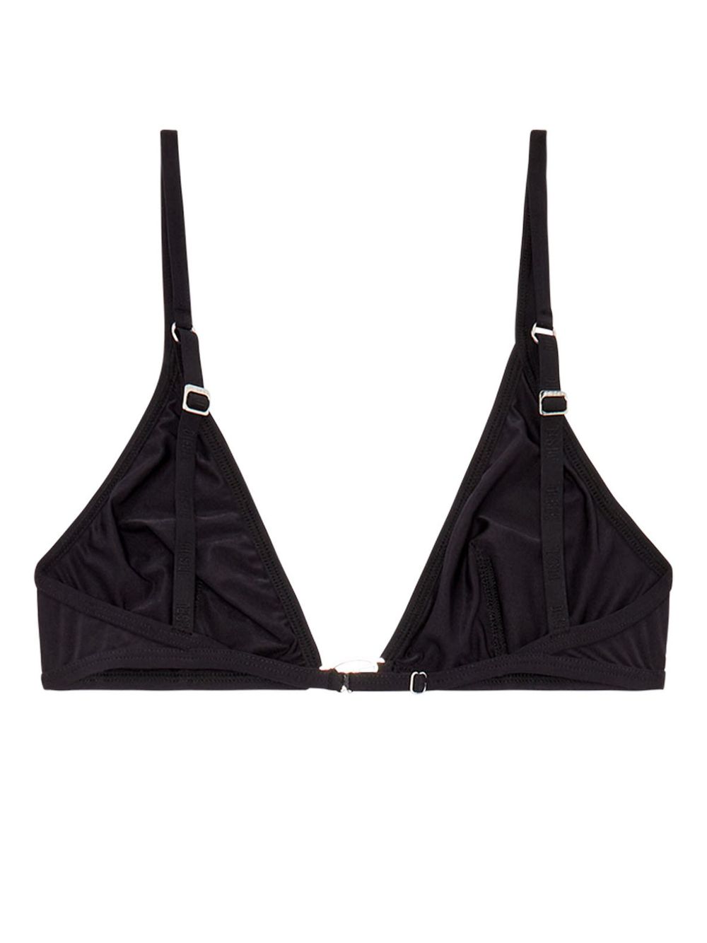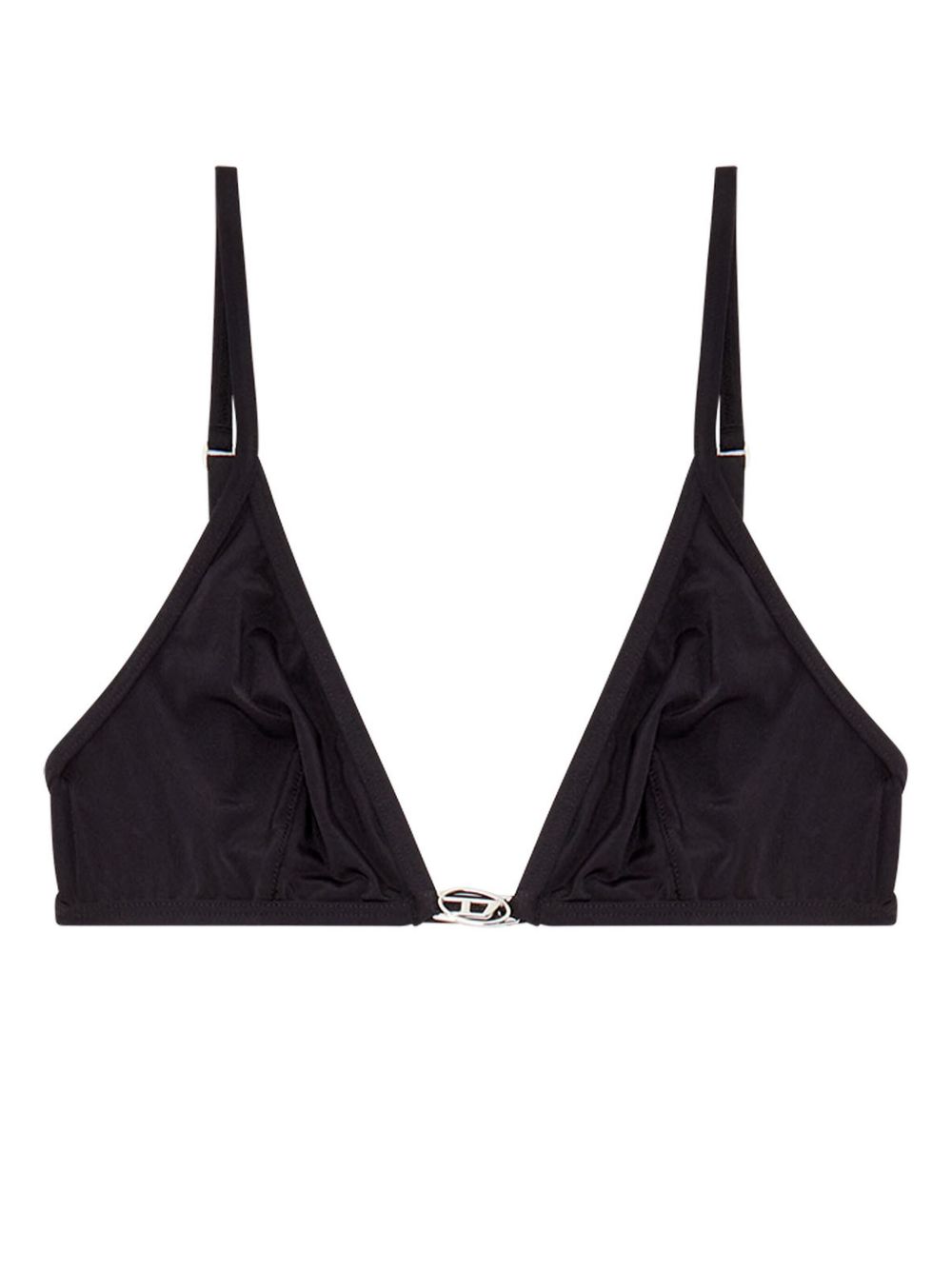 Black Diesel bra in polyester with stretch design, tone-on-tone stitching, logo plaque, silver color, triangle cup, hook closure at the back, and adjustable straps.