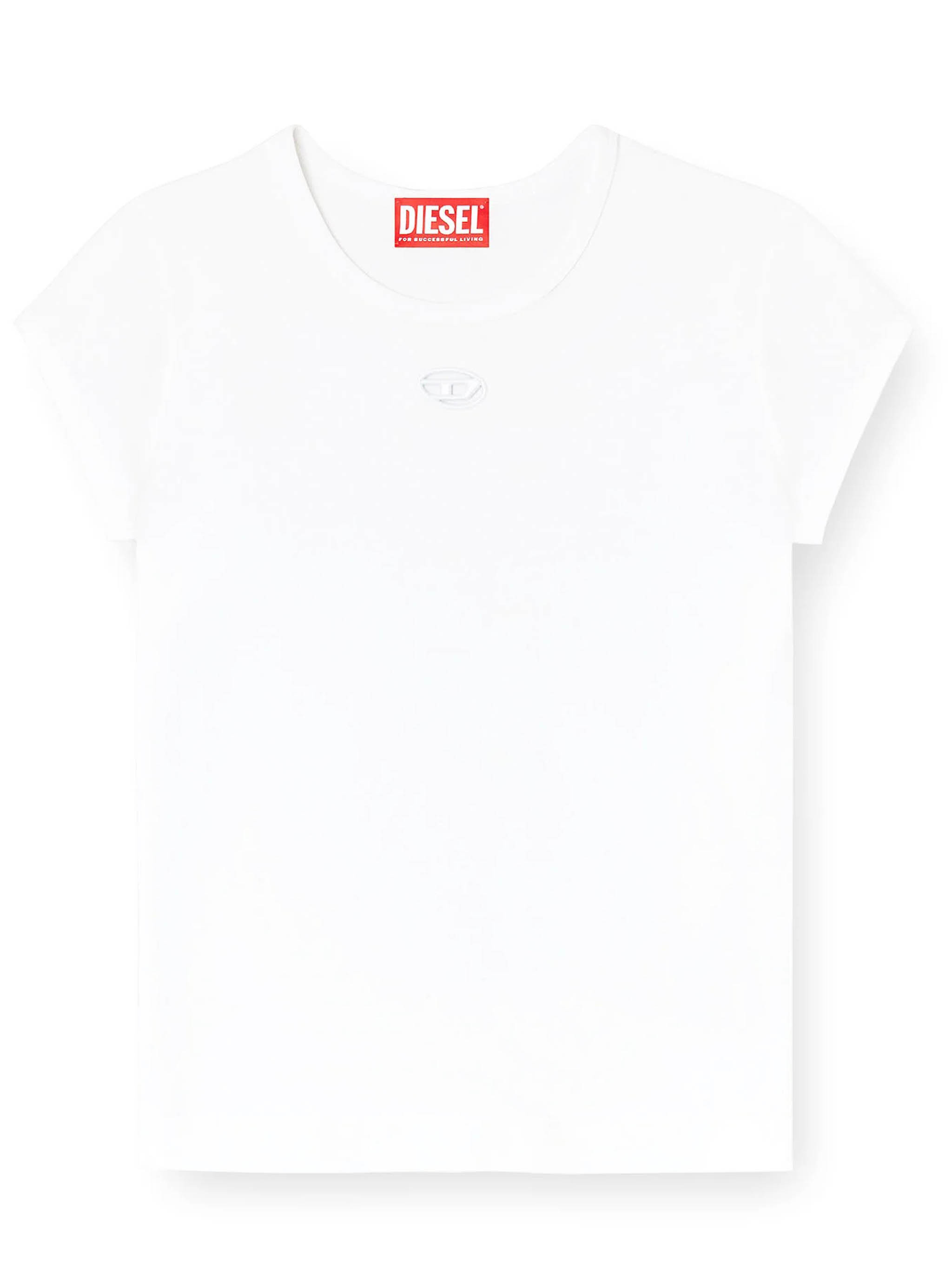 White T-Angie OD T-shirt by Diesel, made of cotton, featuring a laser-cut design, an embroidered logo, and short sleeves.