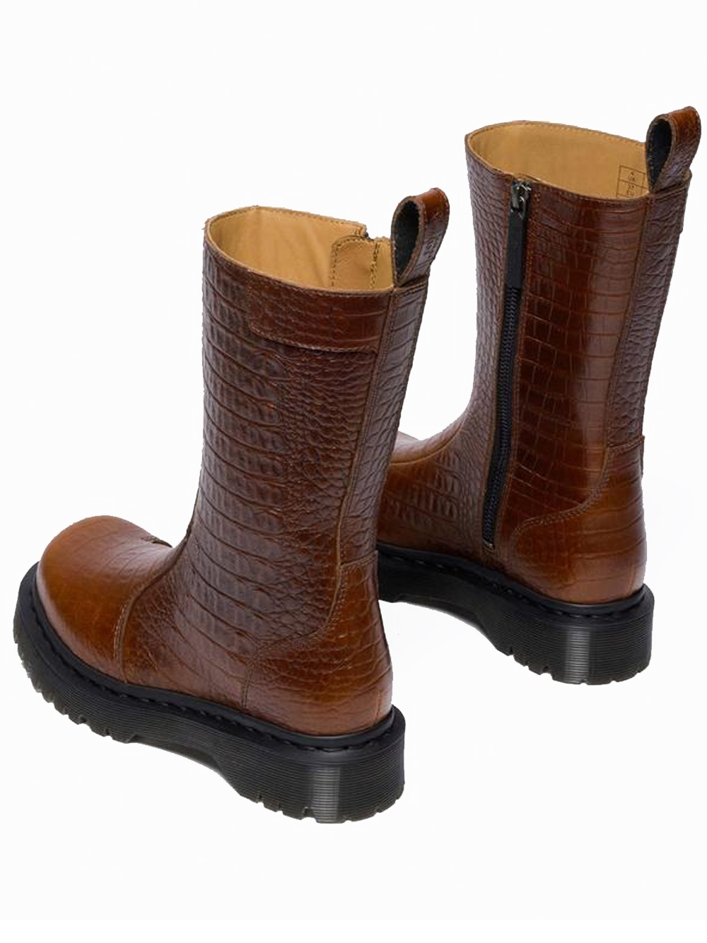 Brown Rejena boots by Dr. Martens in leather with a slightly square toe, side zip closure, and black rubber sole.