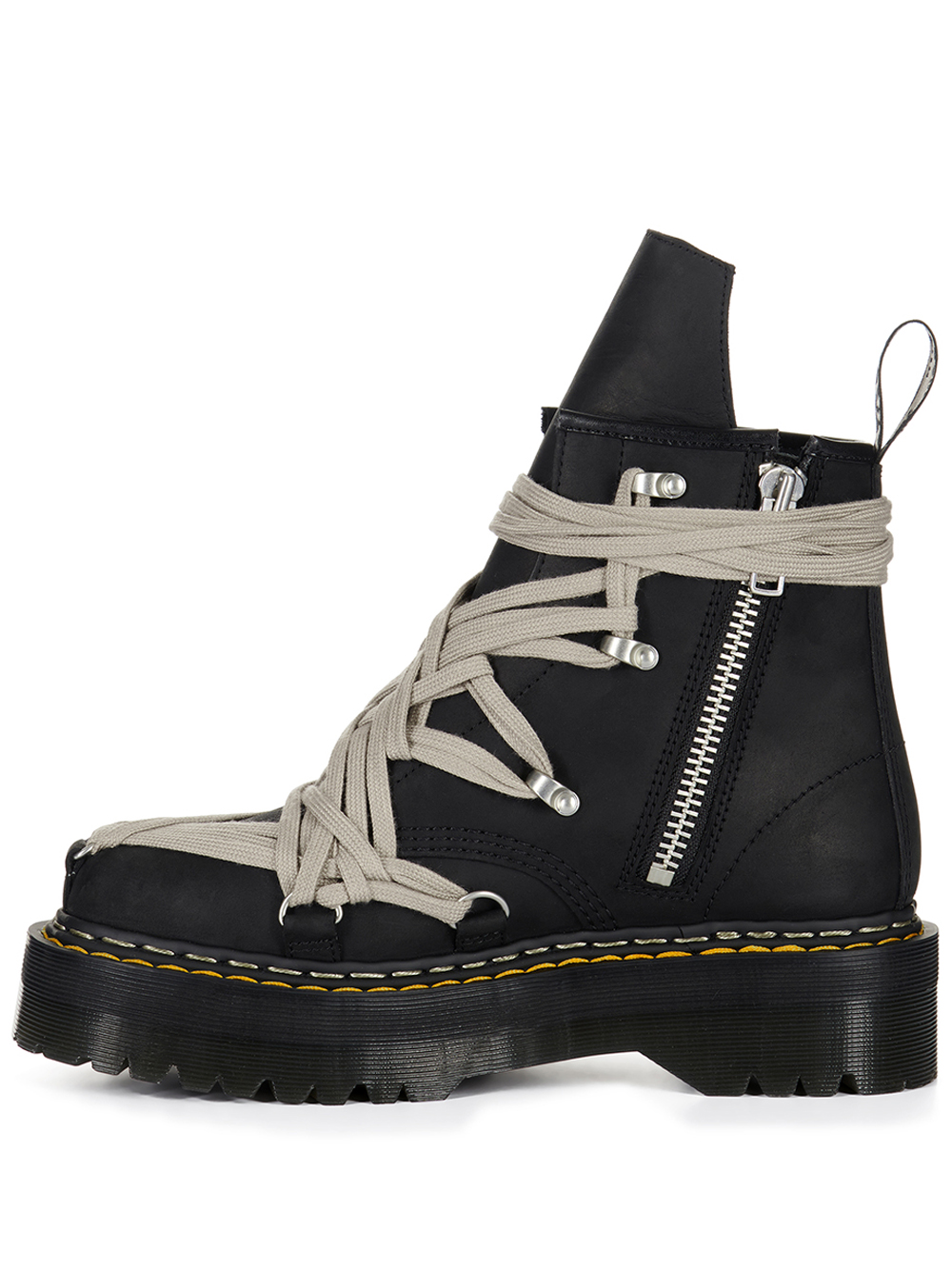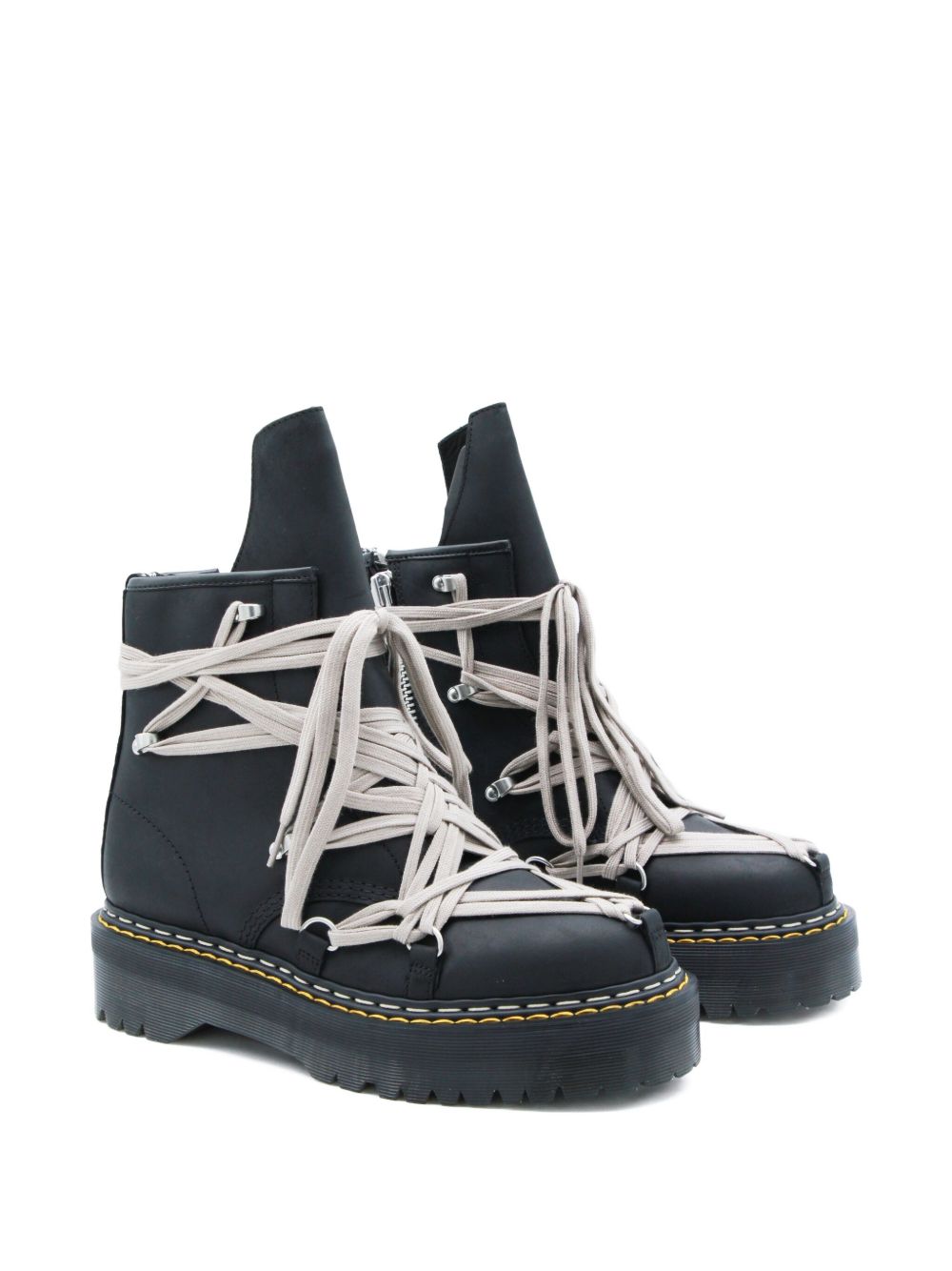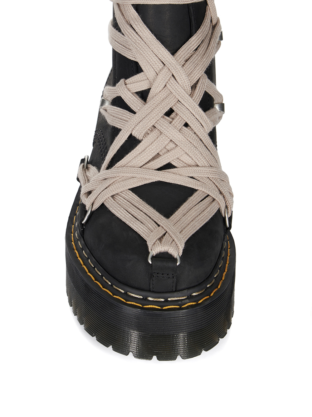 Black leather Dr. Martens x Rick Owens 1460 Megalace boots with extra-long pearl laces, hooks and loops, double pearl and yellow stitching, and a thick sole.