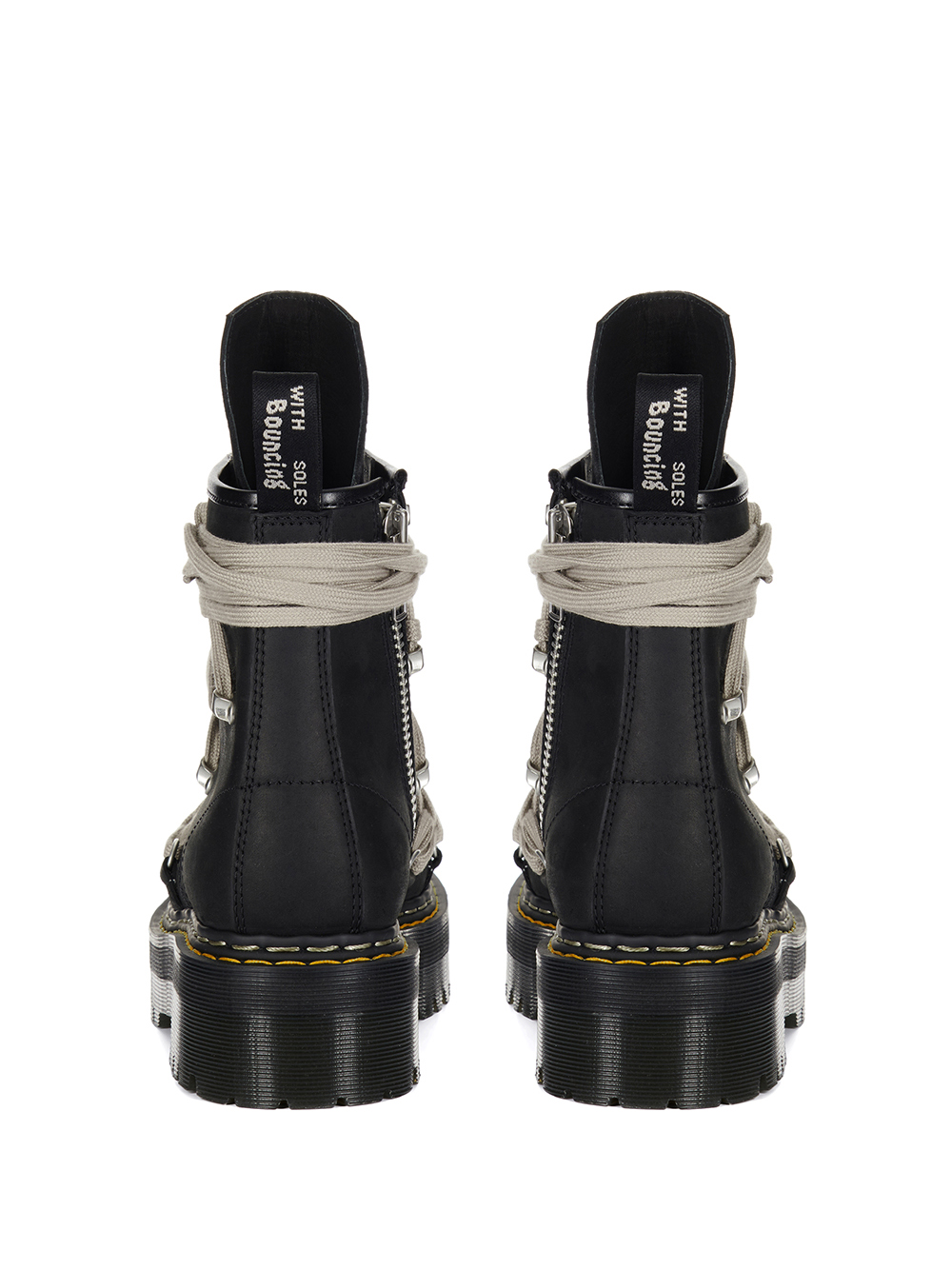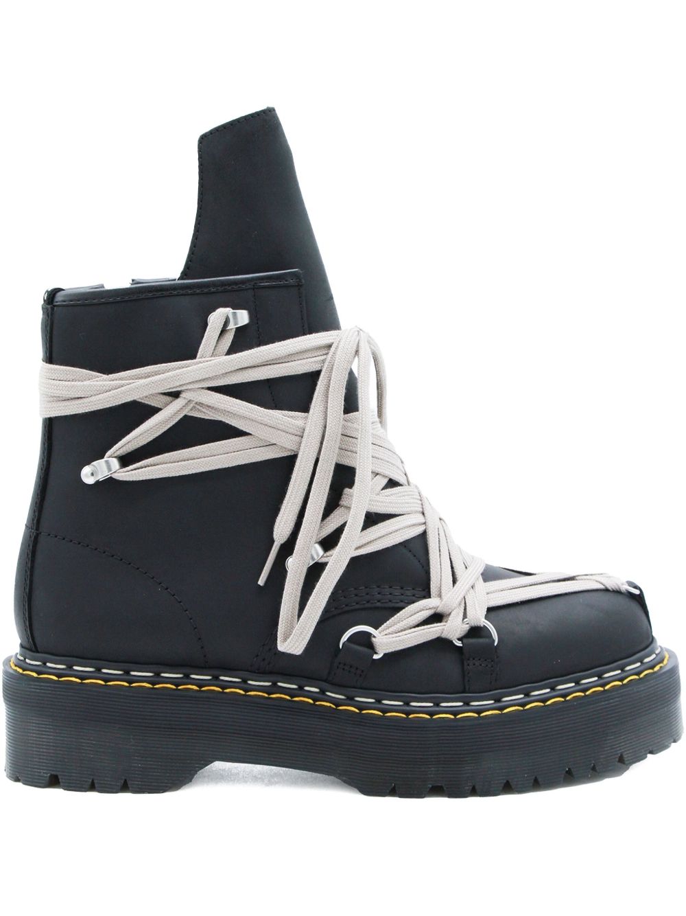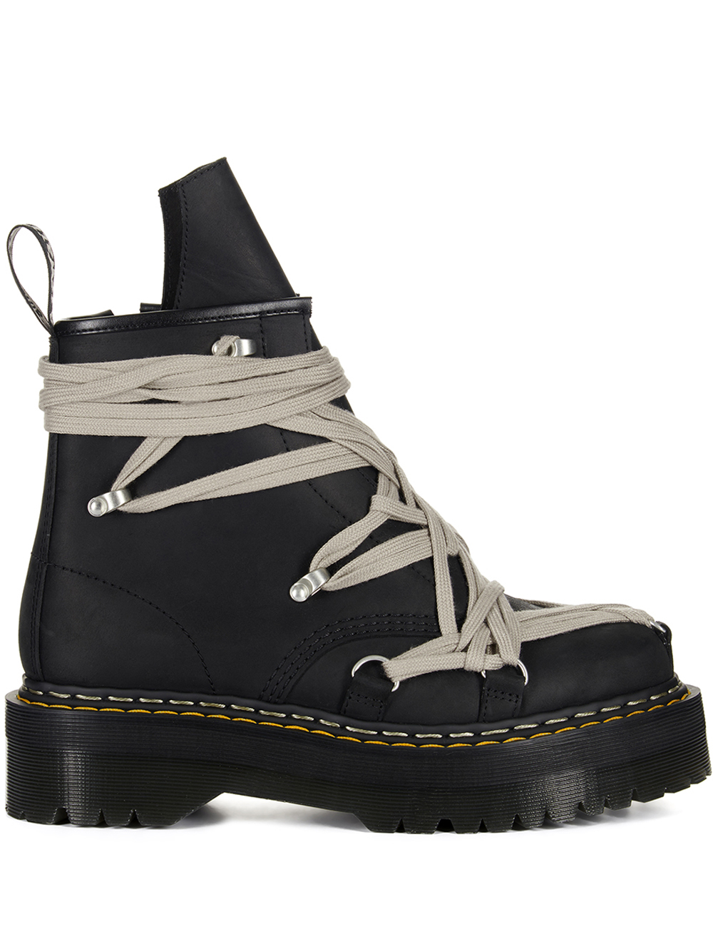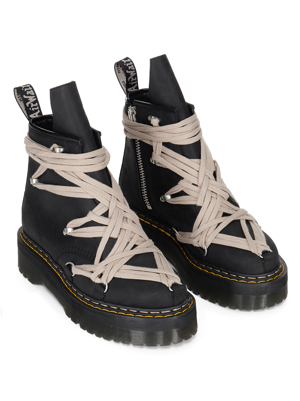 Black leather Dr. Martens x Rick Owens 1460 Megalace boots with extra-long pearl laces, hooks and loops, double pearl and yellow stitching, and a thick sole.
