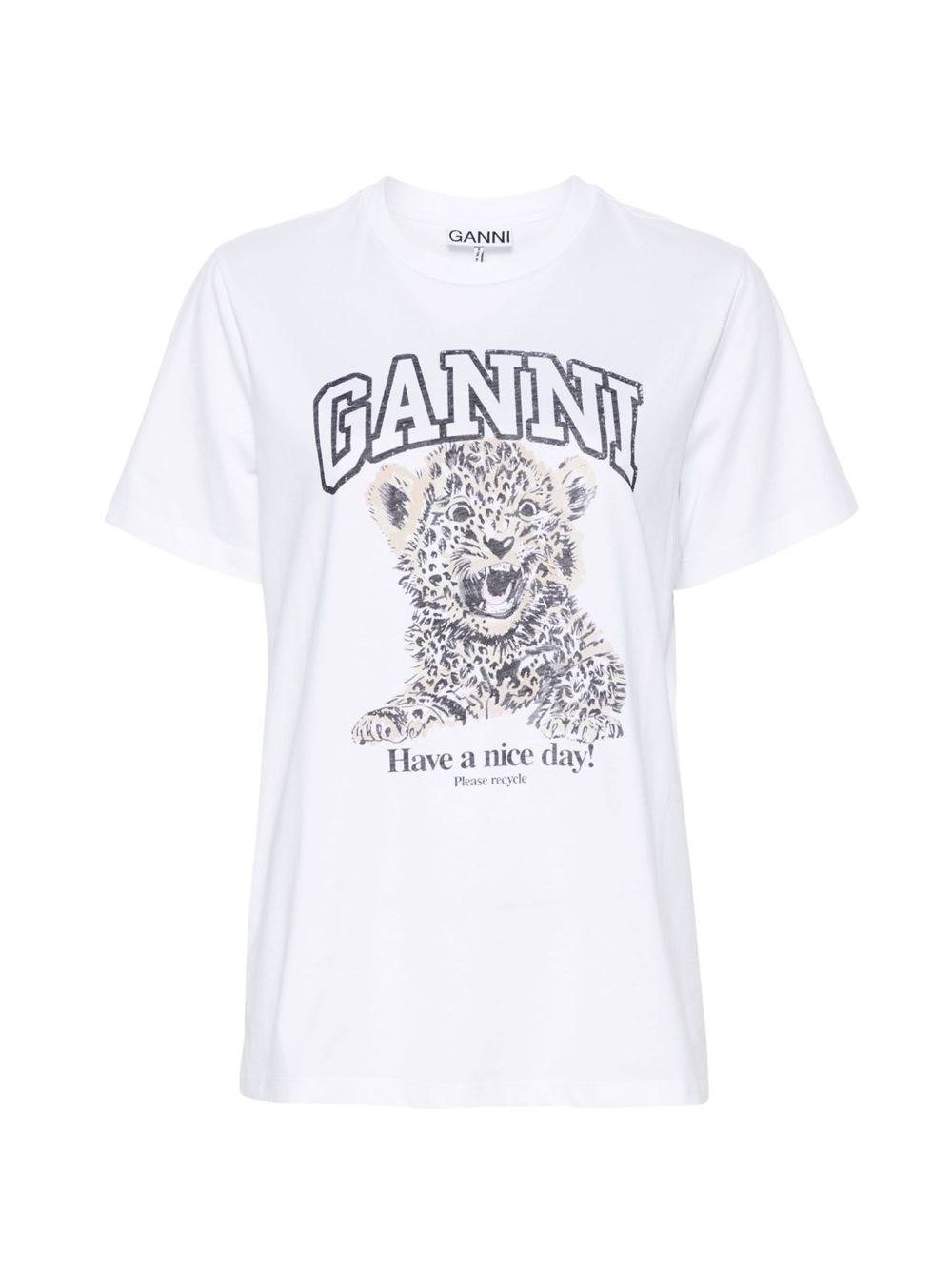 White cotton T-shirt by Ganni with a crew neck, short sleeves, a front print, and a straight hem.