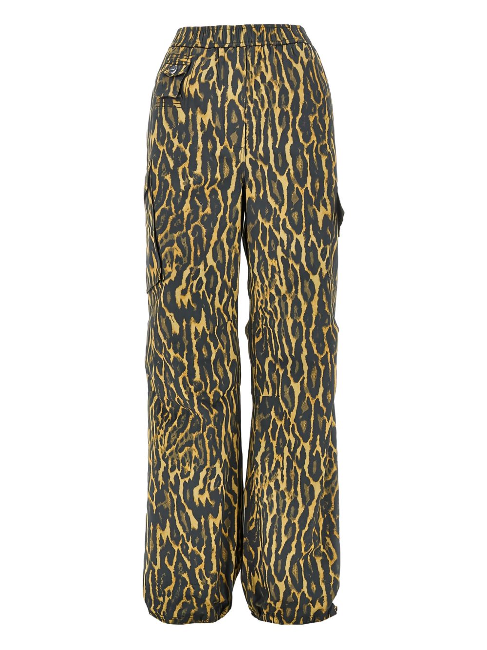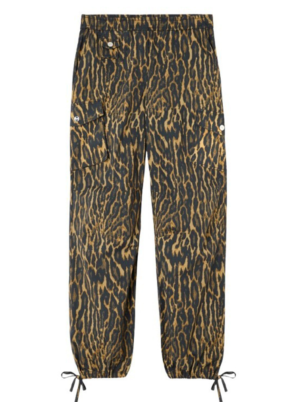 Khaki printed cotton cargo pants with an elastic waistband, cargo pockets, and drawstring hems.