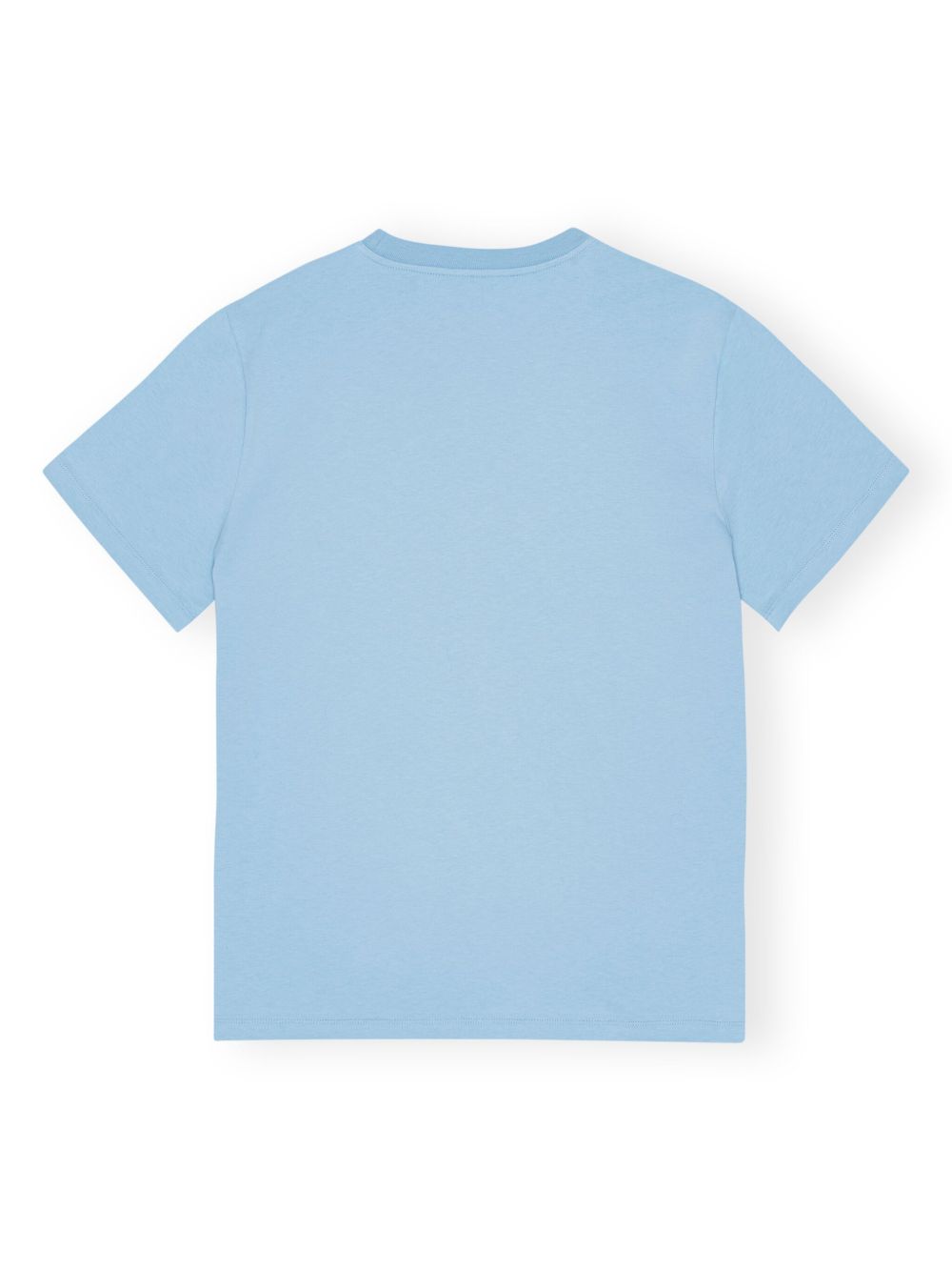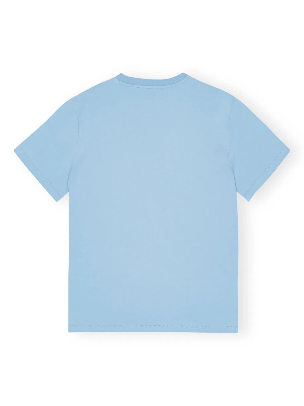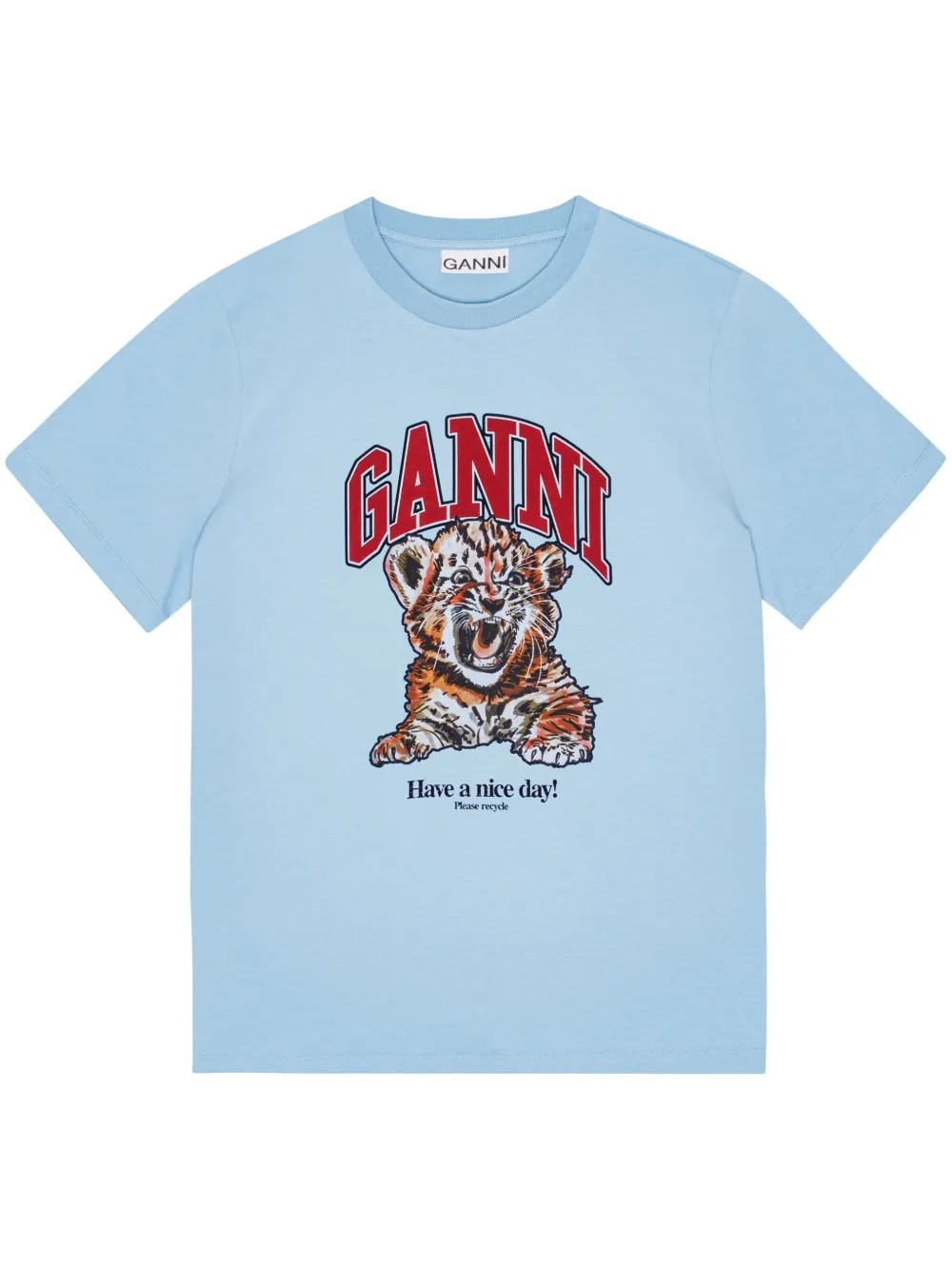 Light blue cotton T-shirt by Ganni with a graphic print on the front, a crew neck, and short sleeves.