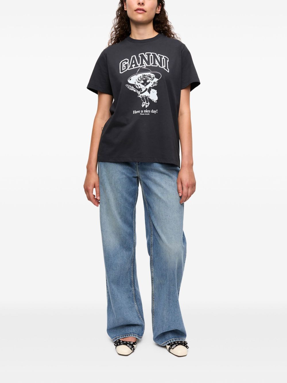 Black cotton T-shirt by Ganni with crew neck, short sleeves, front and back print and a straight hem.
