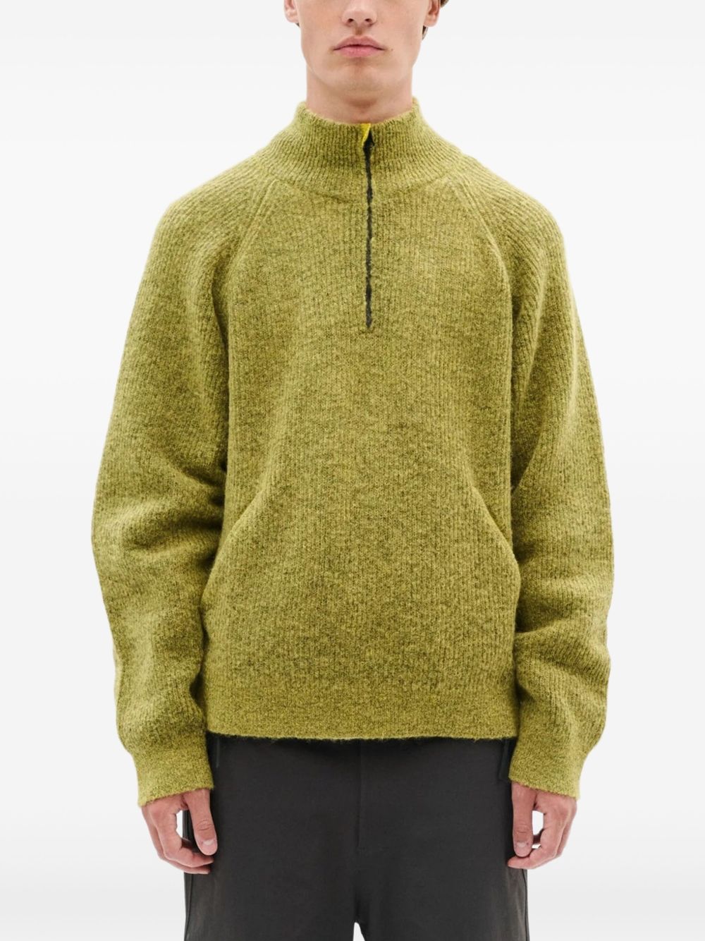 Essence yellow sweater by Hiking Patrolo in wool blend with high neck, zip opening, long sleeves, and straight hem.