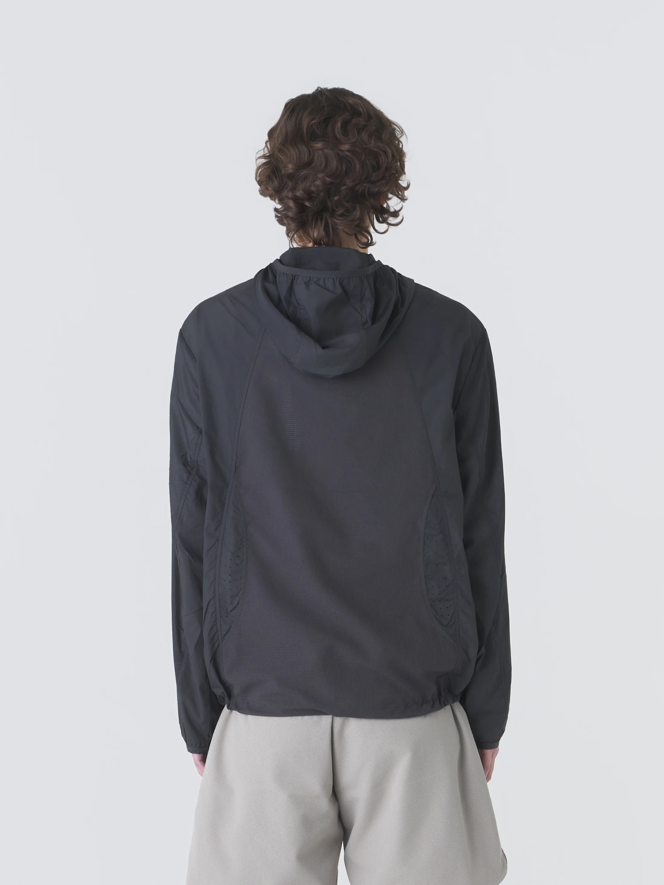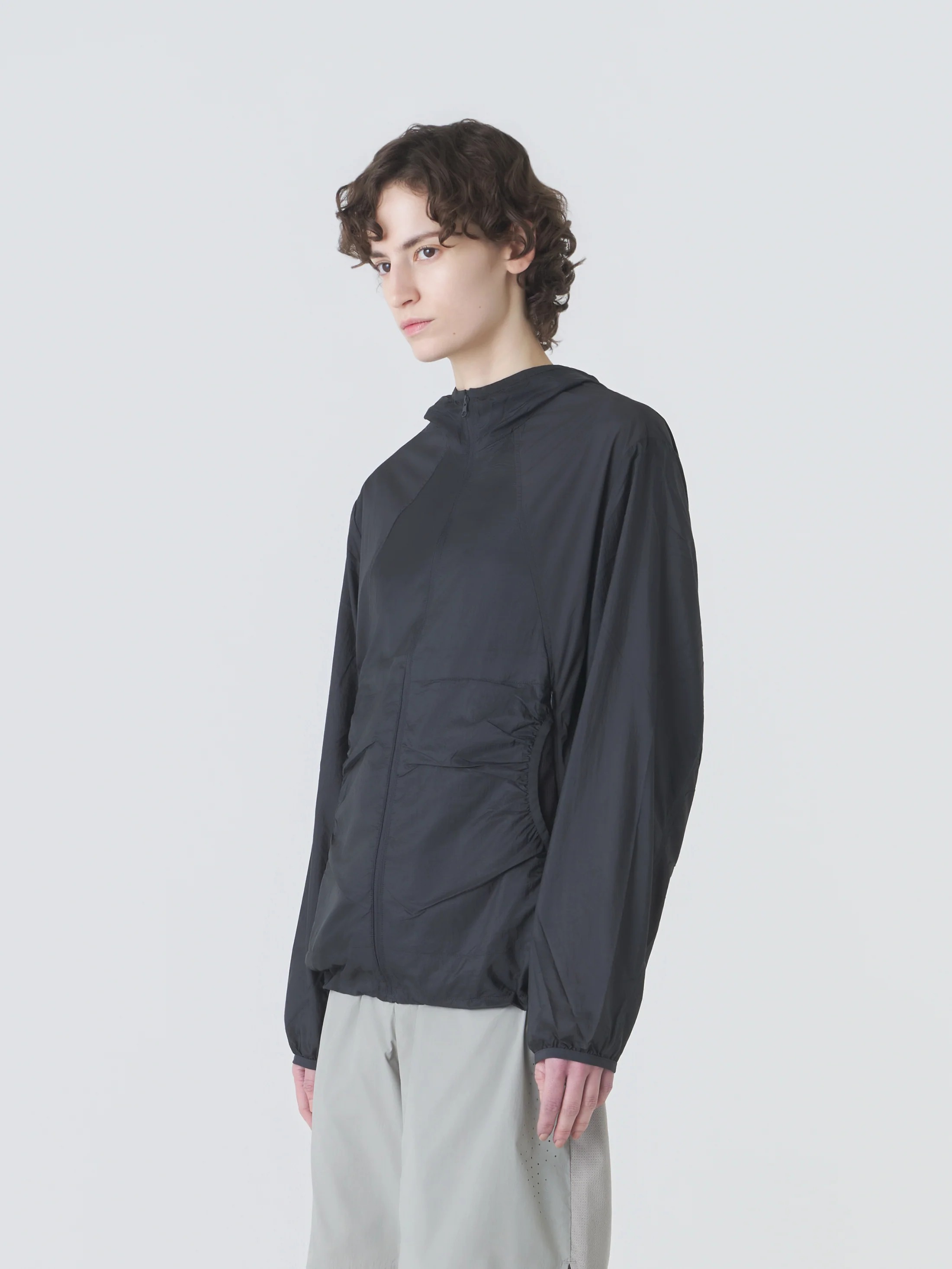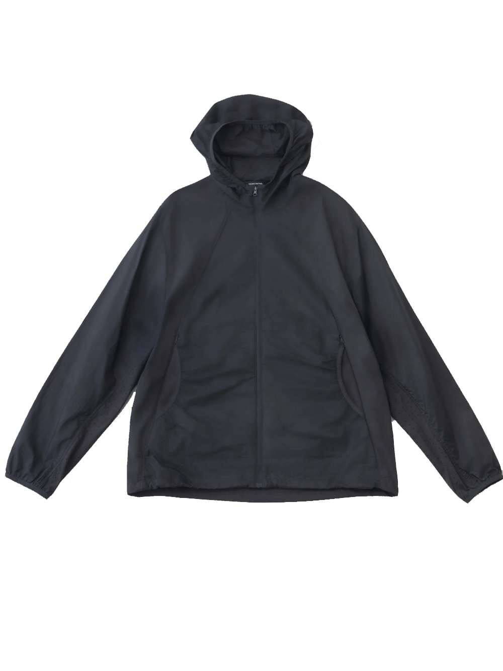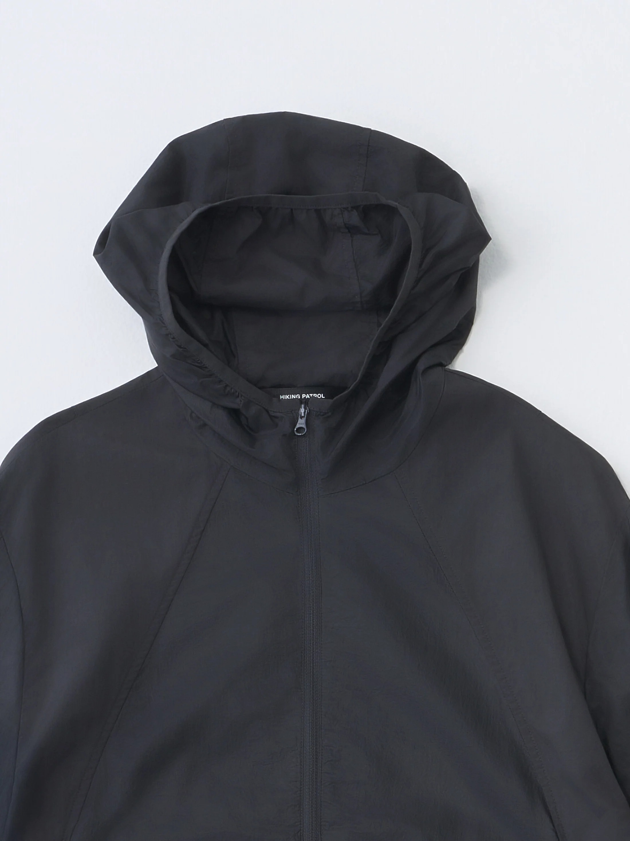 Black Orbit Technical jacket by Hiking Patrol in nylon with hood, front zip closure, side pockets, drawstring hems.