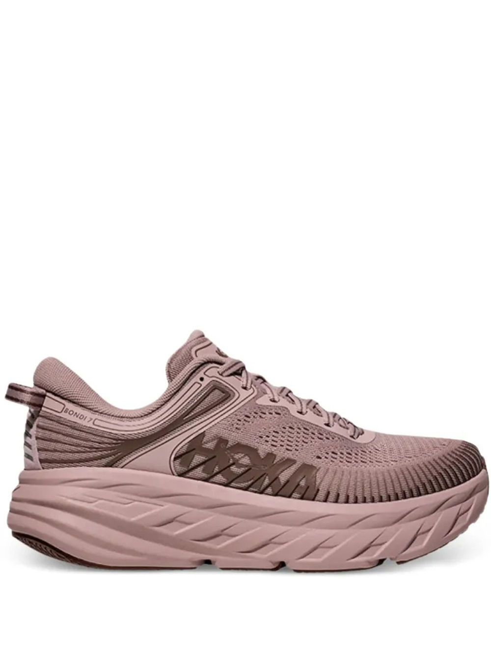 Hoka One One Bondi 7 sneakers with knit upper, logo detail, lace-up closure, round toe, rear tab, logo insole, and chunky rubber sole.