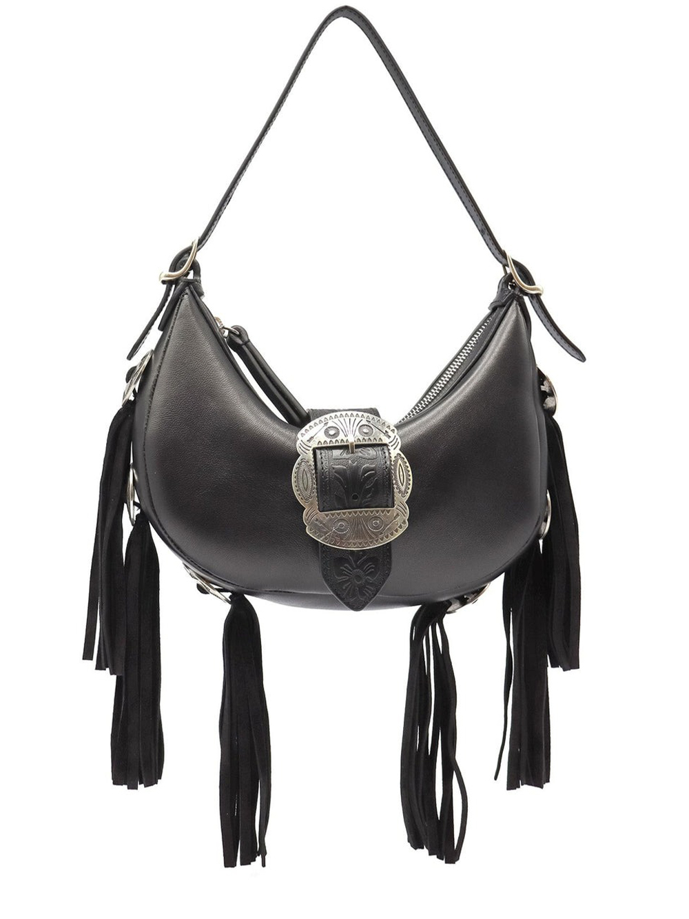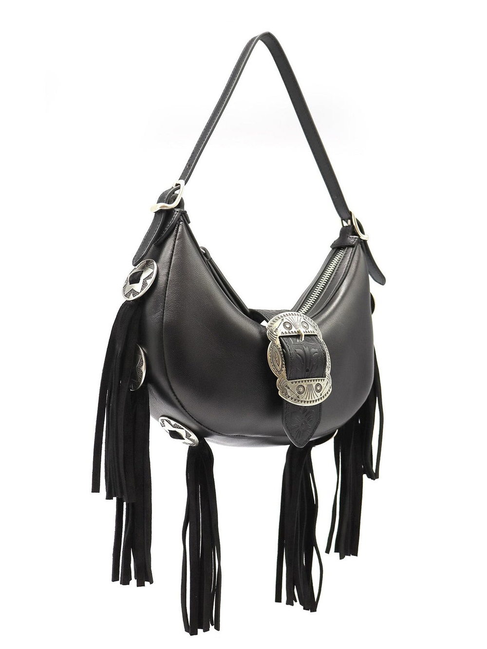 Moon bag in Black, featuring a zip closure, fringes and concho-details.