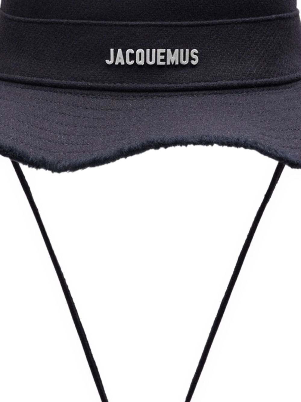 Navy Le Bob Artichaut hat by Jacquemus in cotton with fisherman silhouette, adjustable drawstring, metal logo application and soft brim with fringed edges.