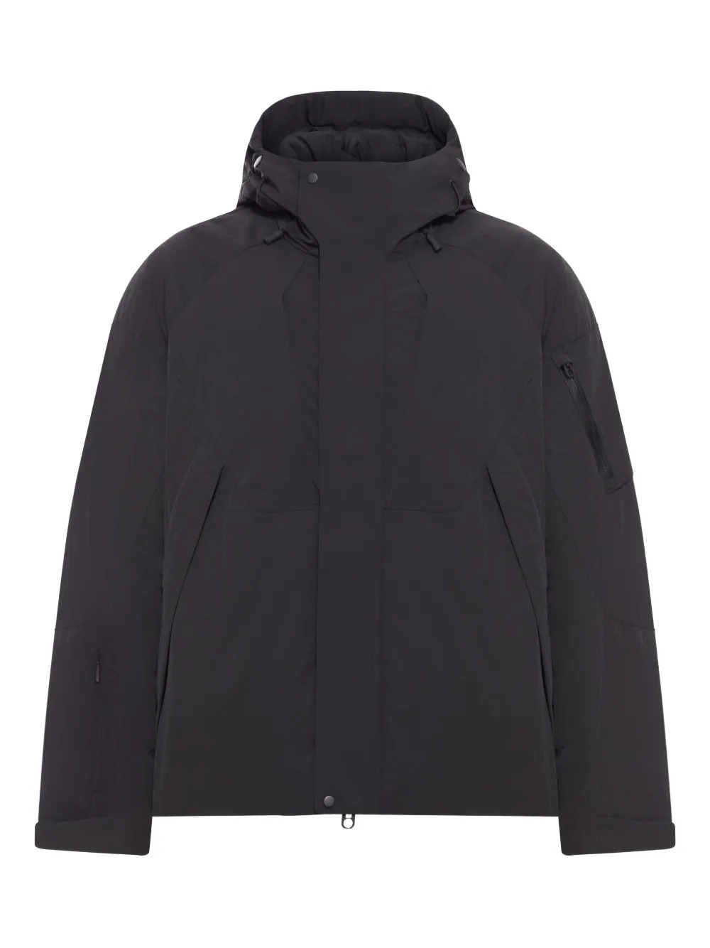 Black JG1 padded nylon jacket with adjustable drawstring hood, zip closure, long sleeves, vertical zip pocket on the sleeves, slanted front pockets, adjustable cuffs with hook-and-loop closure, and large zip pocket on the back.