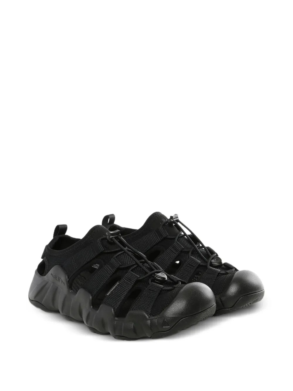 Keen x Snow Peak Hyperport H2 black sandals featuring a cage design, heel tab, round toe, drawstring closure, and chunky rubber sole.
