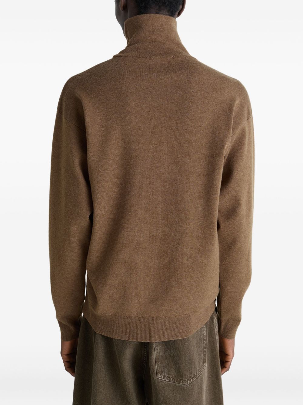 Brown wool sweater by Lemaire with crew neck, long sleeves, ribbed hem, and ribbed cuffs.