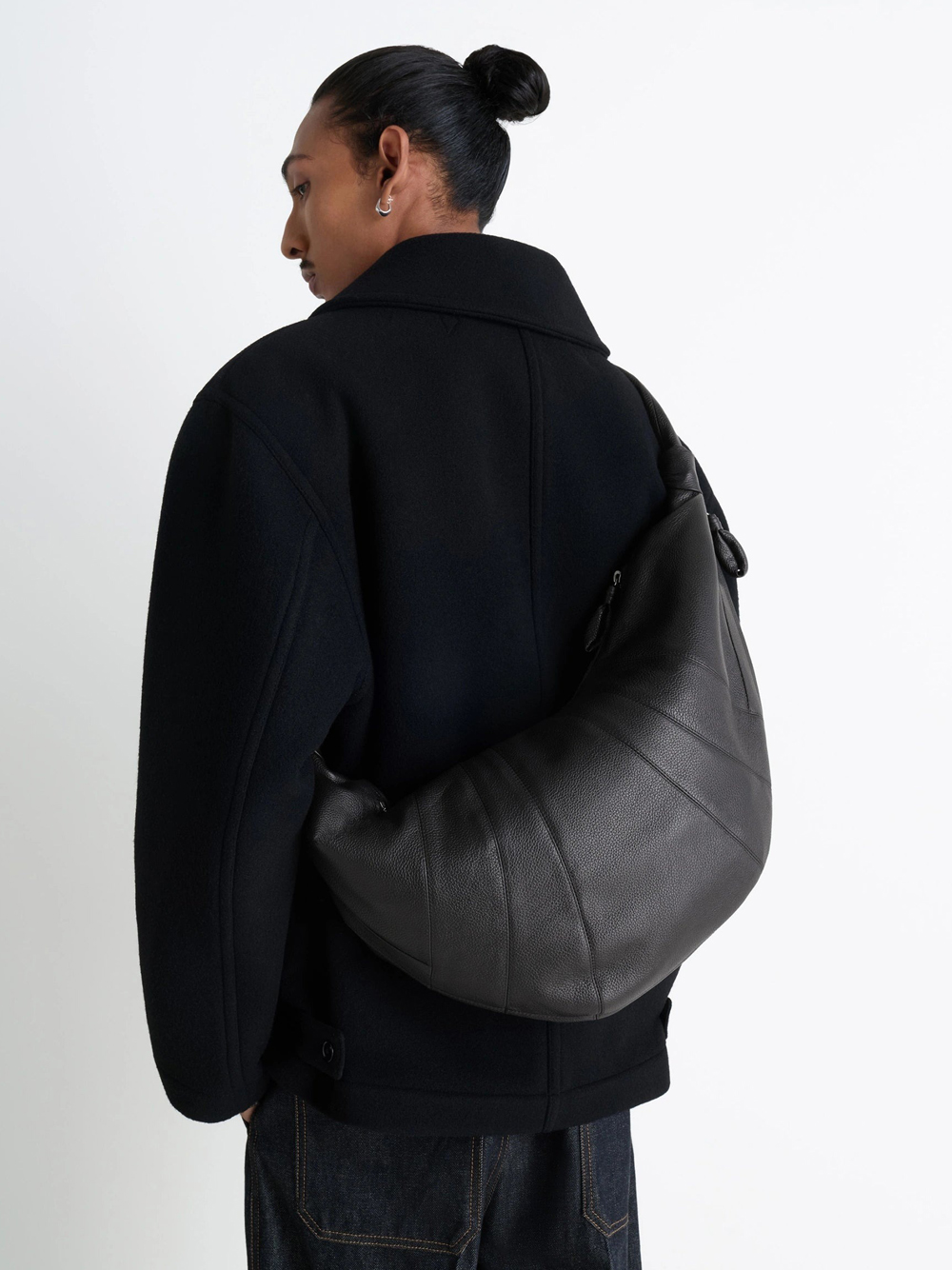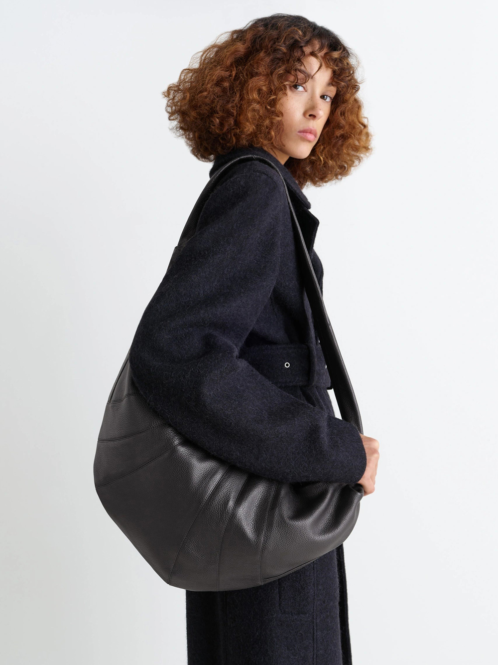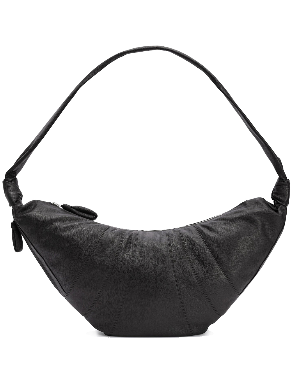 Lemaire Large Croissant leather bag in black with a glossy finish, zip closure, single handle, external side pocket with zip, and tone-on-tone stitching.