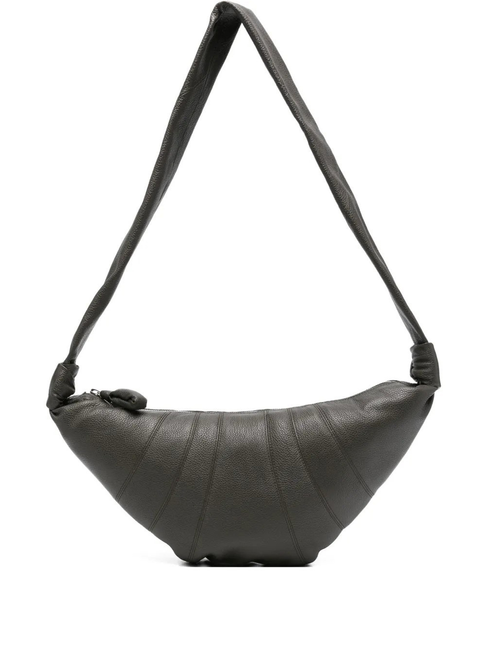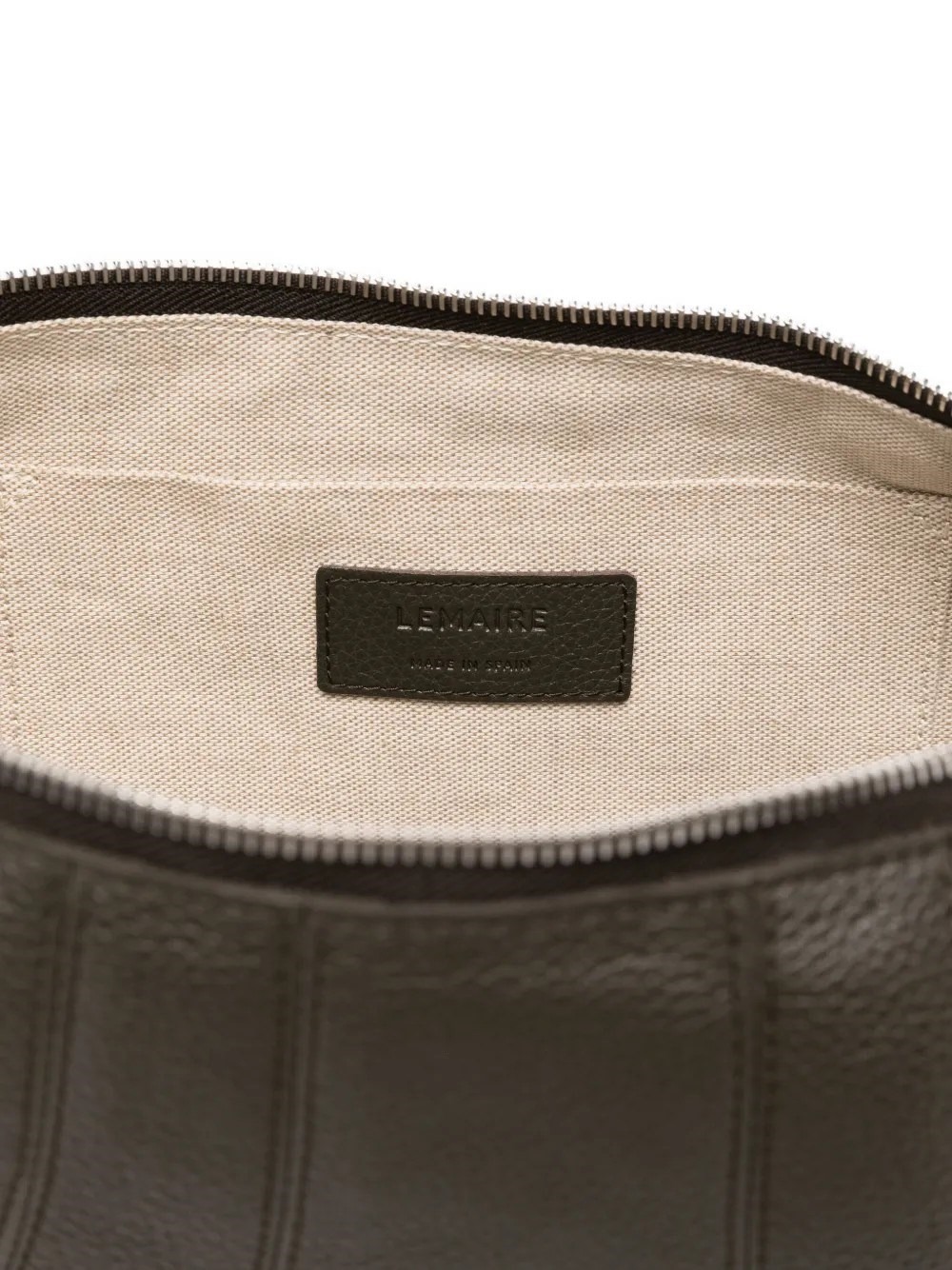 Dark Brown (Maracage) Croissant Medium bag by Lemaire in leather with a patina finish, zipper closure, single handle, exterior side zippered pocket, and tone-on-tone stitching.