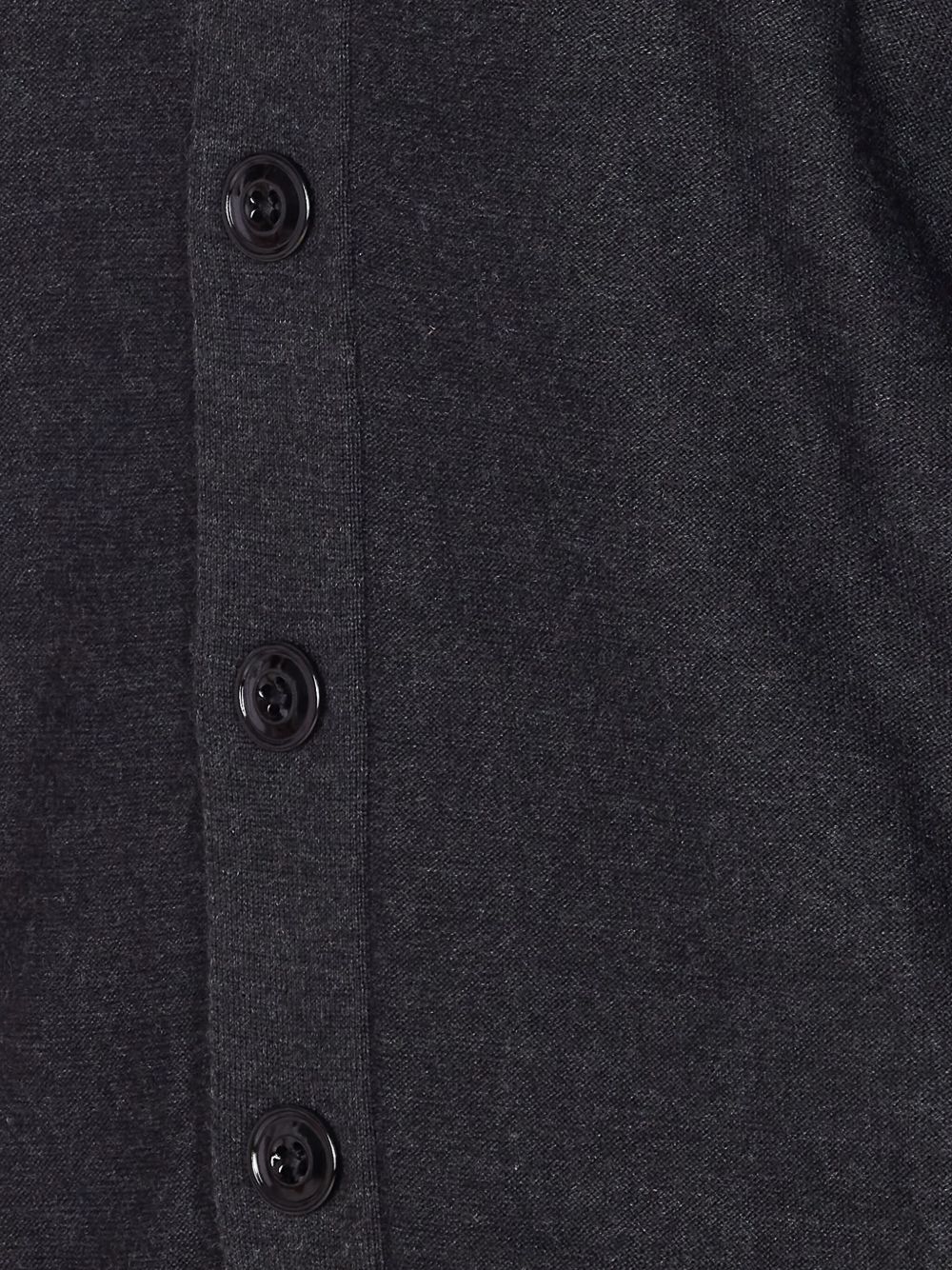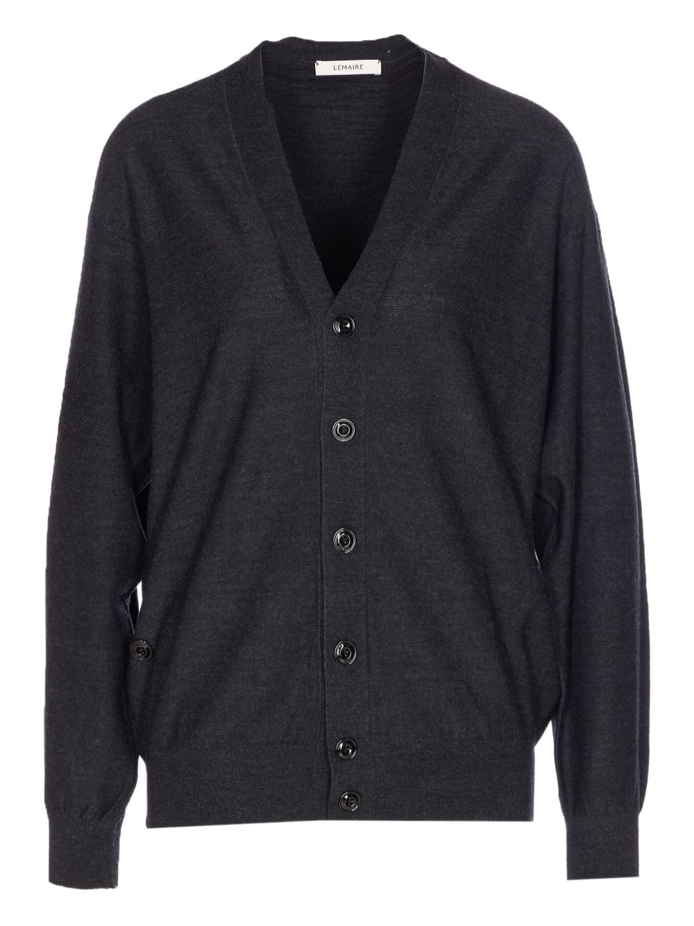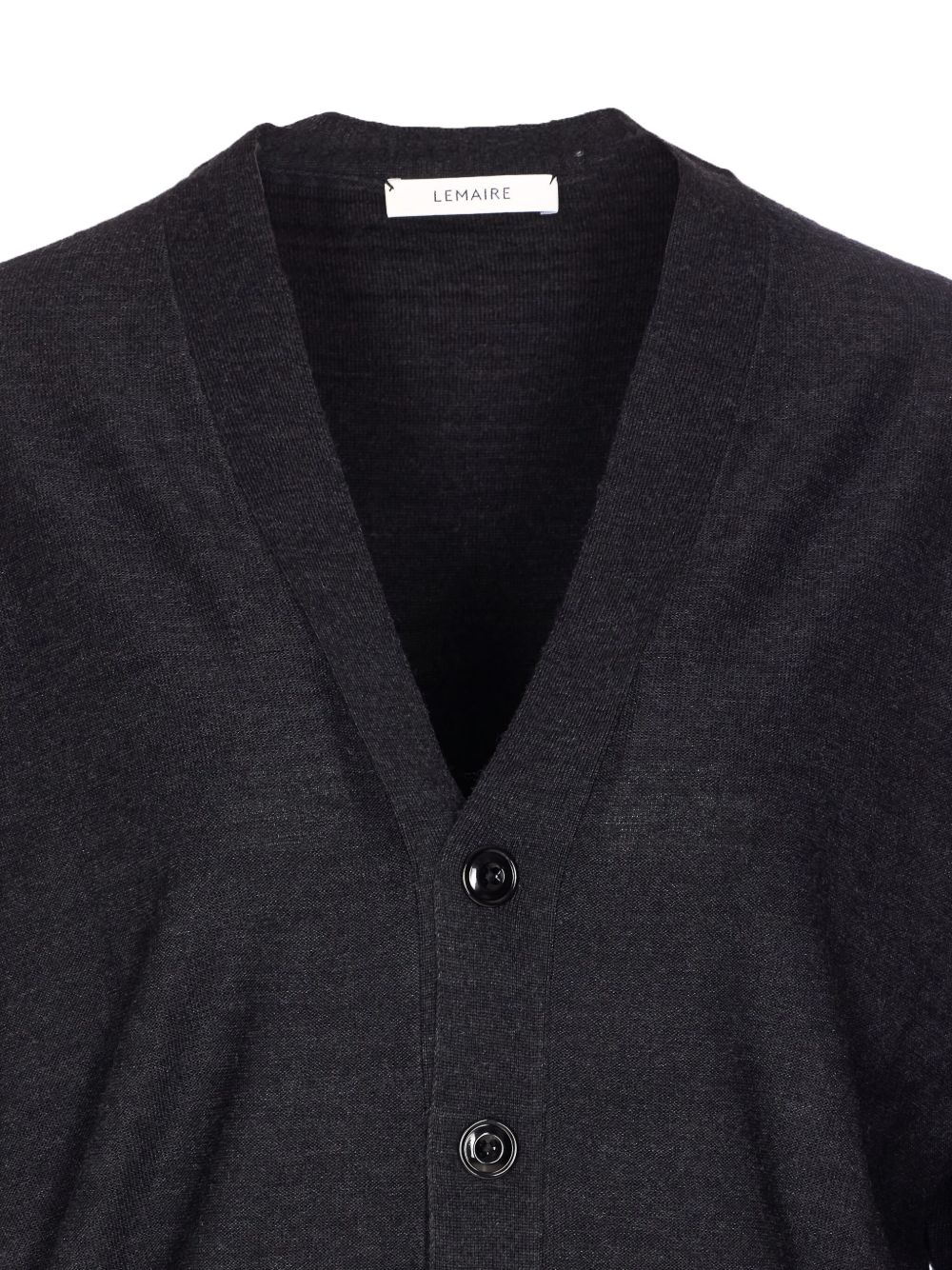 Lemaire Relaxed Twisted anthracite cardigan in wool and acrylic blend, relaxed fit, V-neck, front closure with corozo buttons, long sleeves, ribbed trim, asymmetrical closure with side buttons.