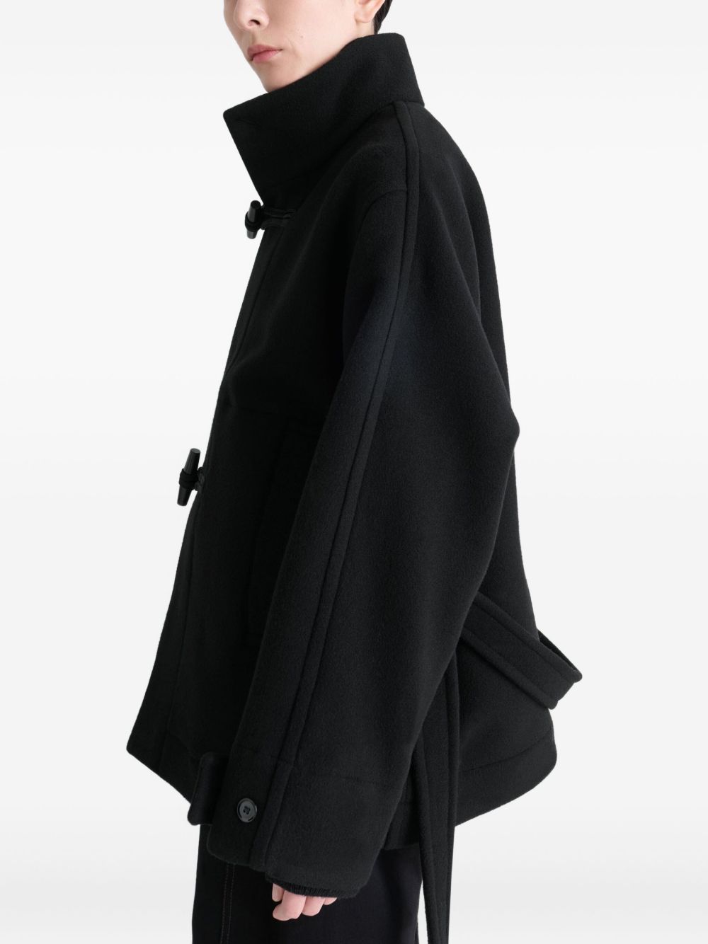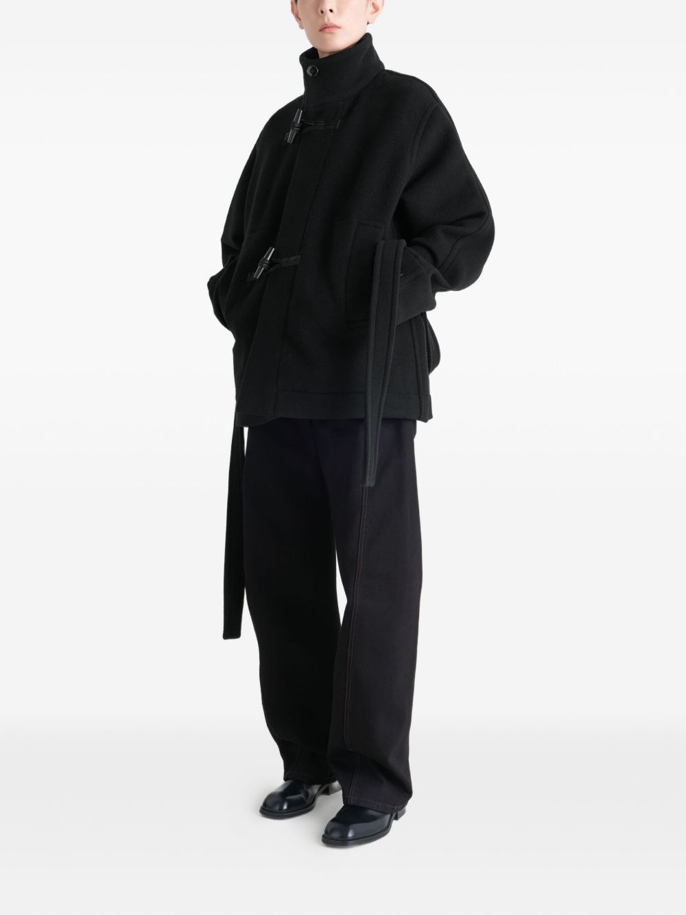 Black Short Duffle Coat by Lemaire in double-sided wool with stand-up collar, toggle closure, belted design, and long sleeves.