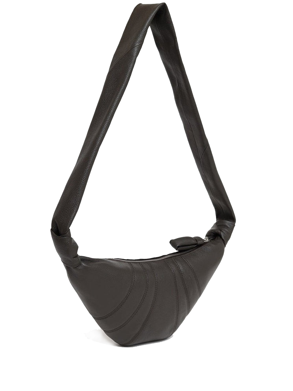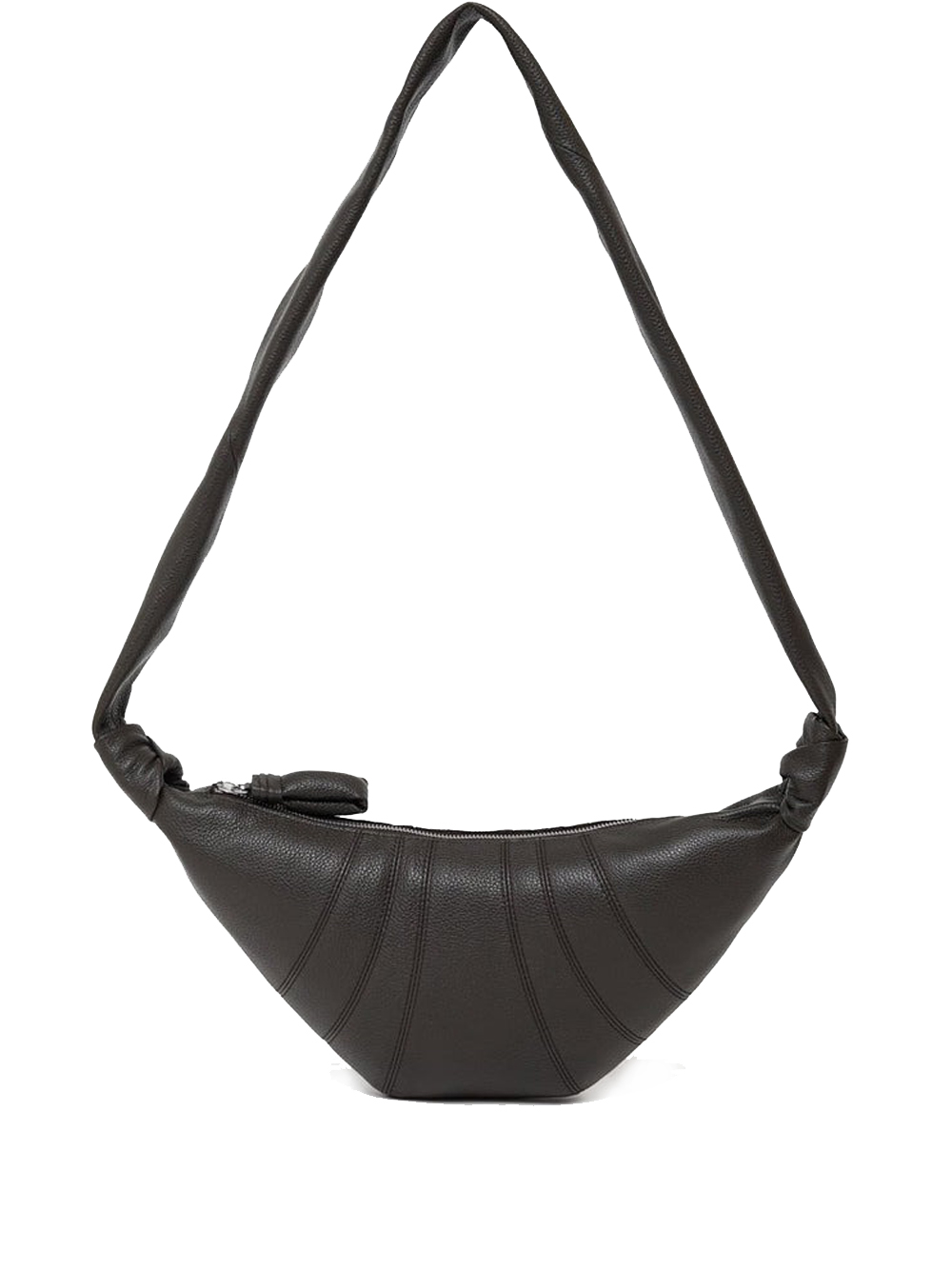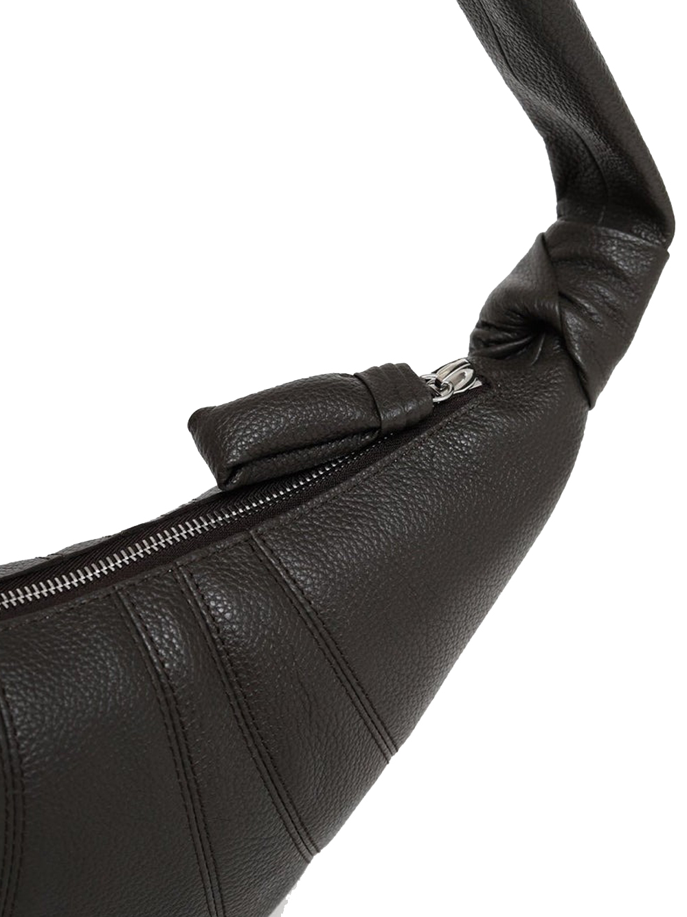 Dark Brown (Maracage) Croissant Small leather bag by Lemaire with a patina finish, zipper closure, single handle, exterior side zippered pocket, and tone-on-tone stitching.