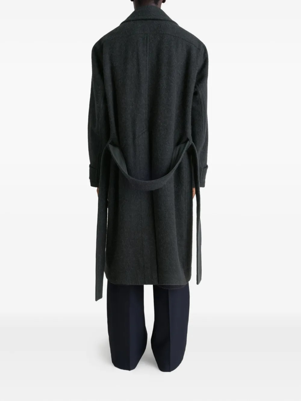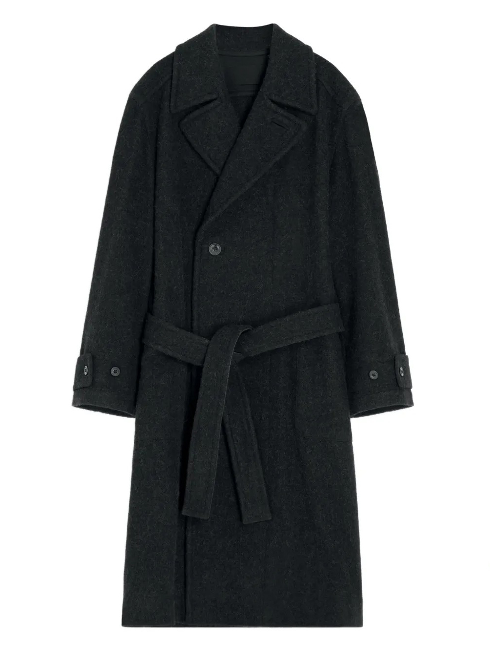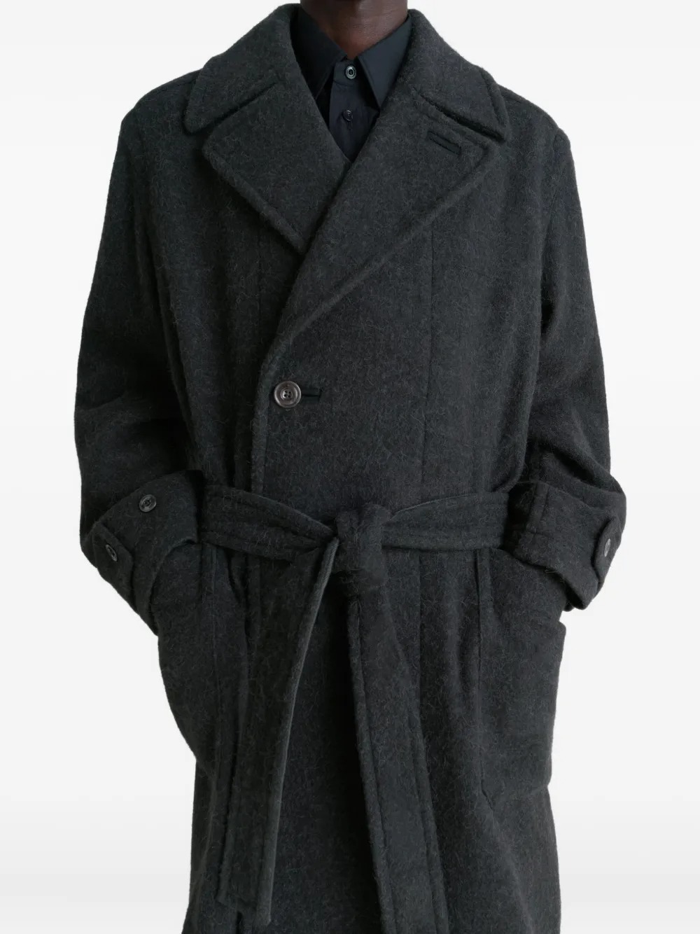 Black Soft Coat jacket by Lemaire in wool-alpaca blend, oversized fit, double-breasted closure with buttons, lapel collar, sleeves with adjustable tabs, removable belt, patch side pockets, unlined interior with herringbone ribbon trim.