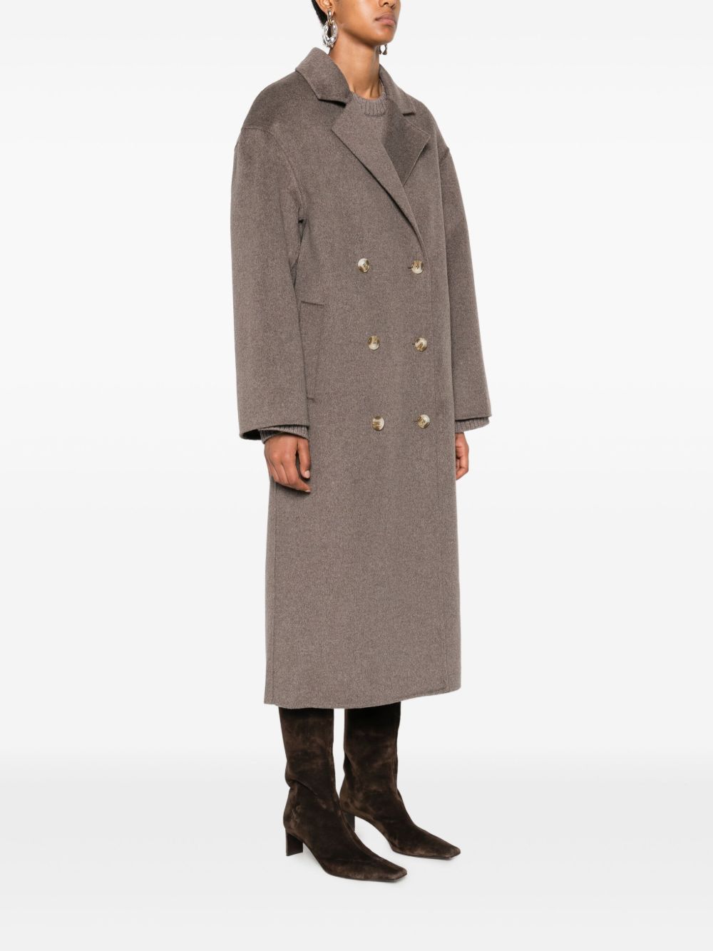 Borneo taupe coat by Loulou Studio in wool with double-breasted front closure, mirrored lapels, dropped shoulders, welt pockets, back vent, and straight hem.