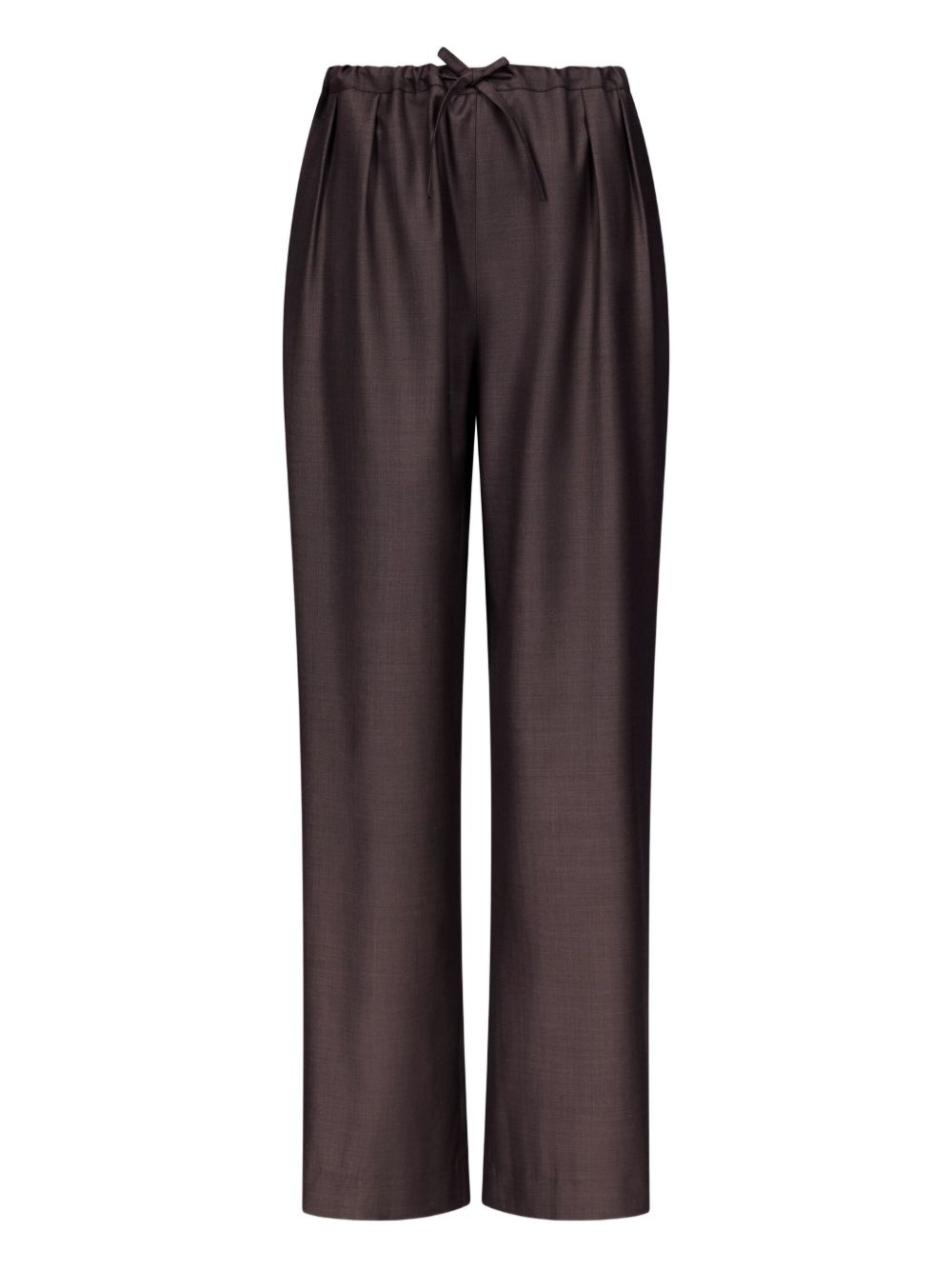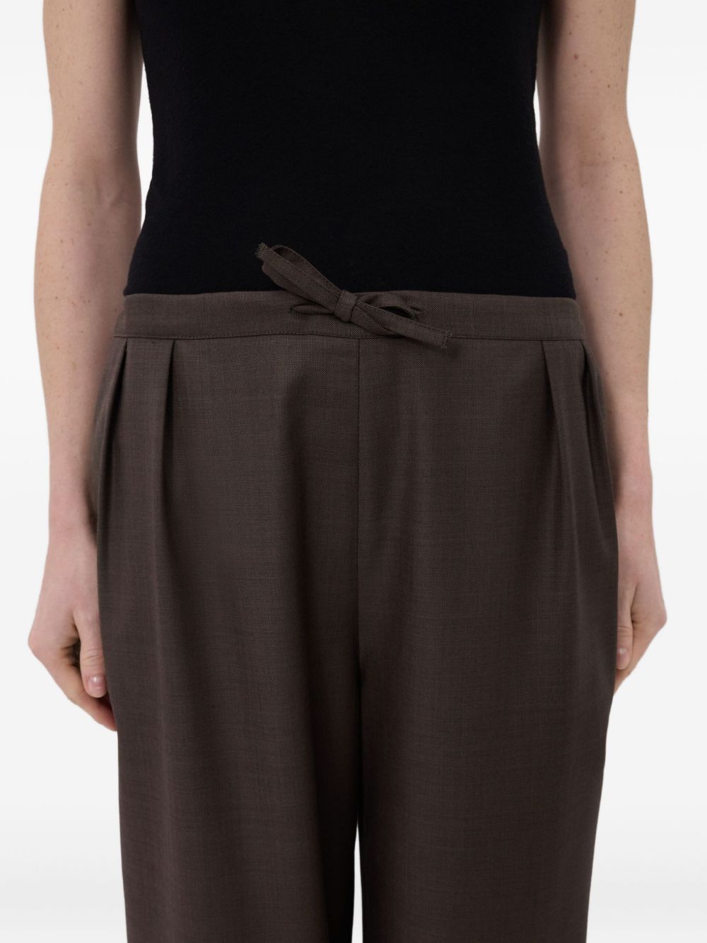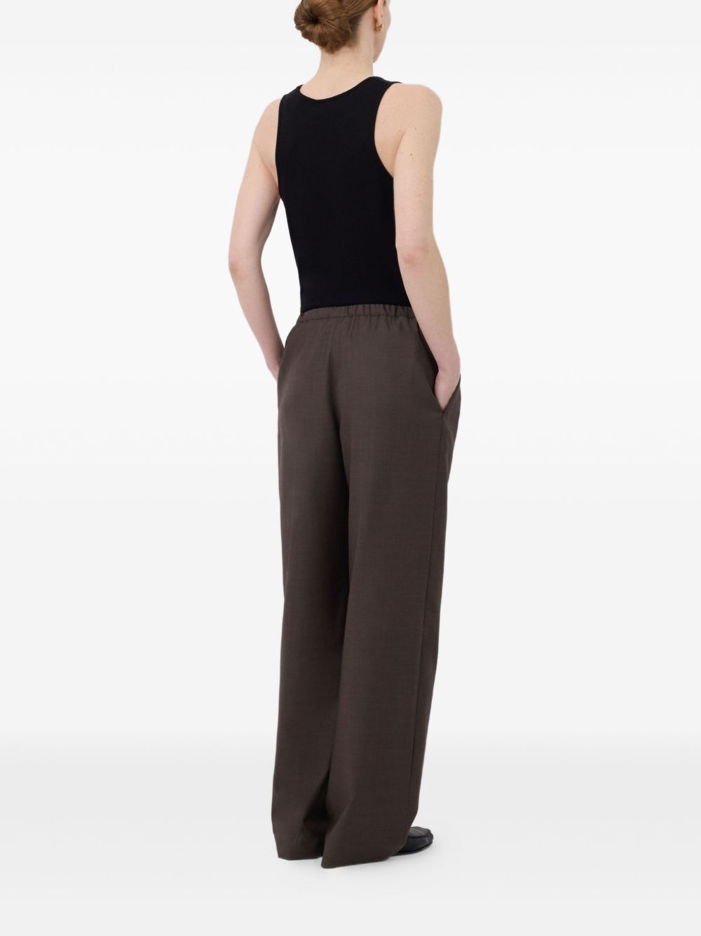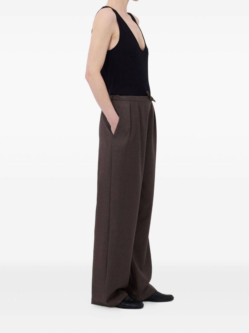 Brown Cove pants by LouLou De Seison in wool with elastic waistband with drawstring, side pockets, and straight hem.
