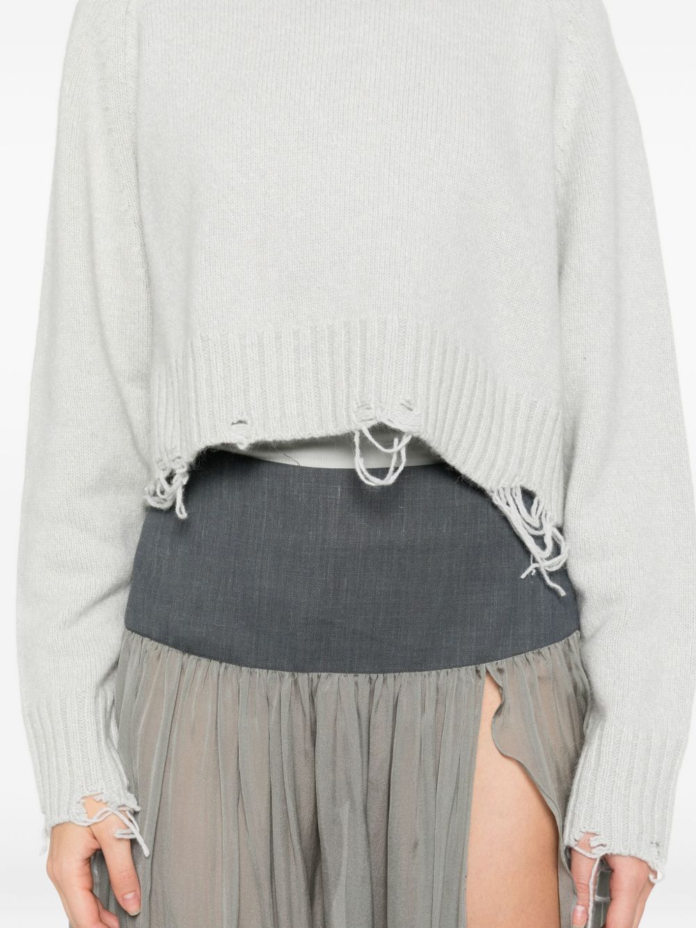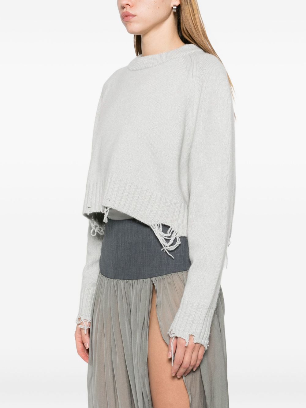 Maglione grigio Damage Cropped di Low Classic in tessuto con bordo con effetto vissuto, girocollo, maniche lunghe, lavorazione in maglia a coste e maniche raglan.