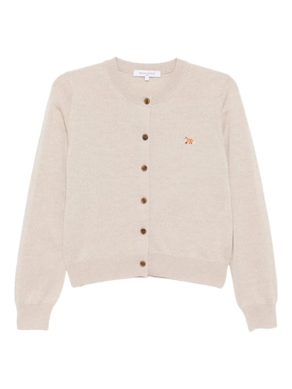 Beige wool cardigan by Maison Kitsuné with fox embroidery, front buttons, long sleeves, and ribbed hem.