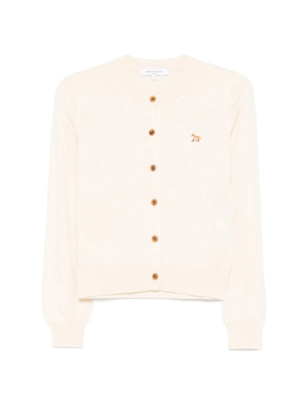 Pearl pink cardigan by Maison Kitsuné in wool with fox embroidery, front buttons, long sleeves, and ribbed hem.