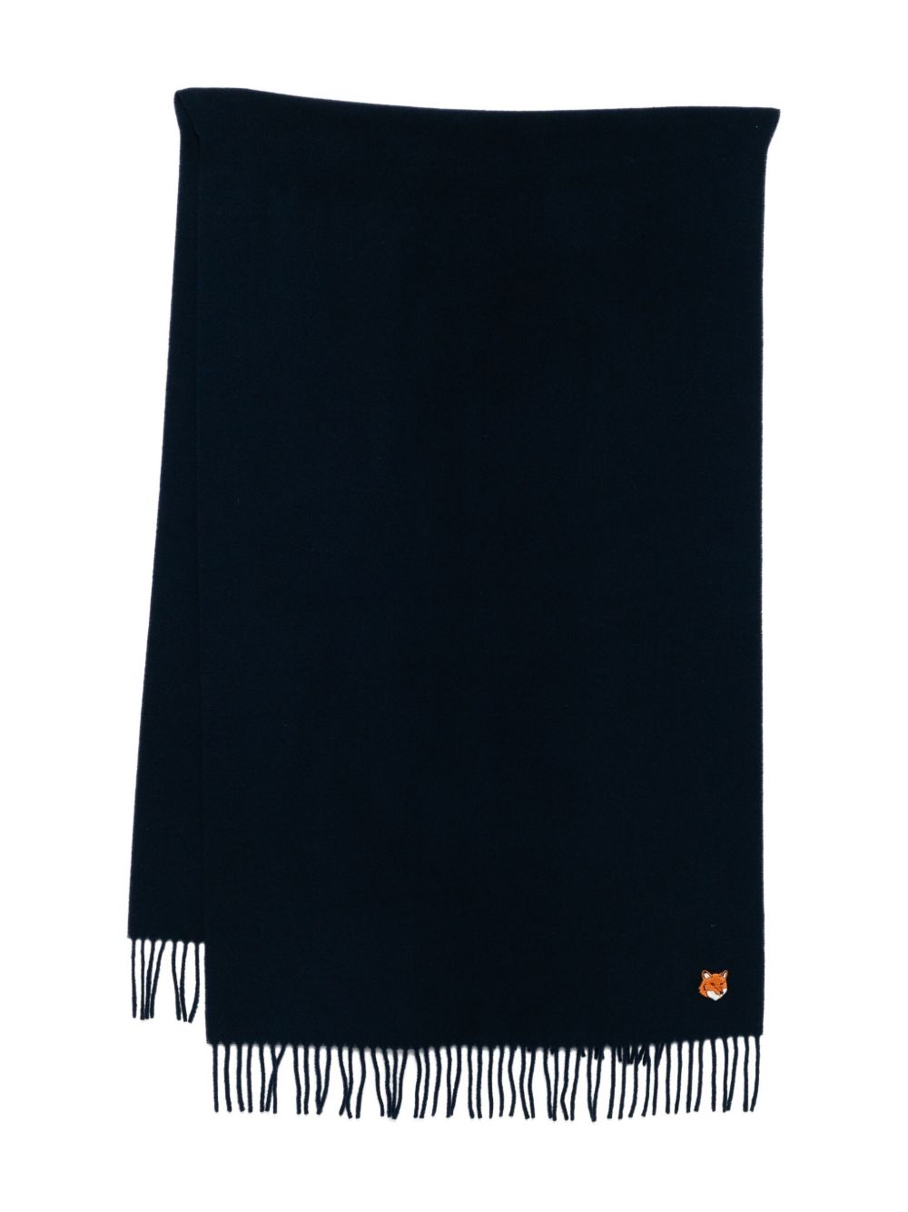 Navy wool scarf by Maison Kitsuné with parch, label, and fringed hem.