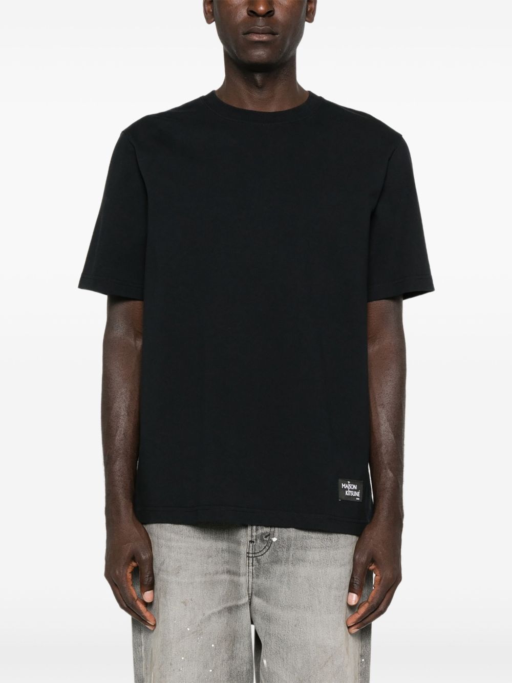 Black cotton T-shirt by Maison Kitsuné with crew neck, short sleeves, front label, print on the back, and straight hem.