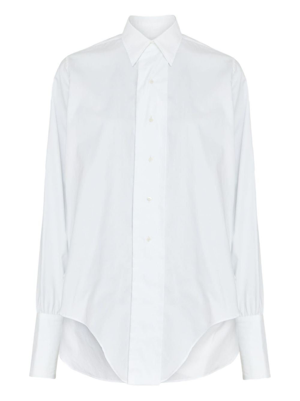White cotton shirt by Maison Margiela with front button closure, classic collar, and curved hem.