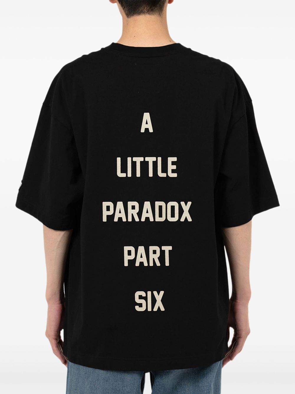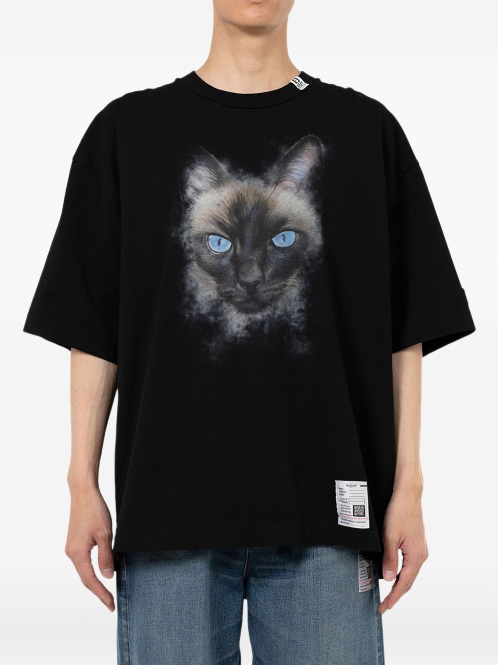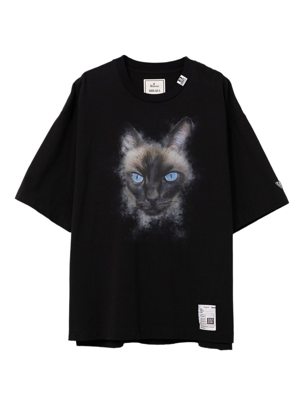 Black cotton T-shirt by Maison Mihara Yasuhiro with a crew neck, front print, and short sleeves.