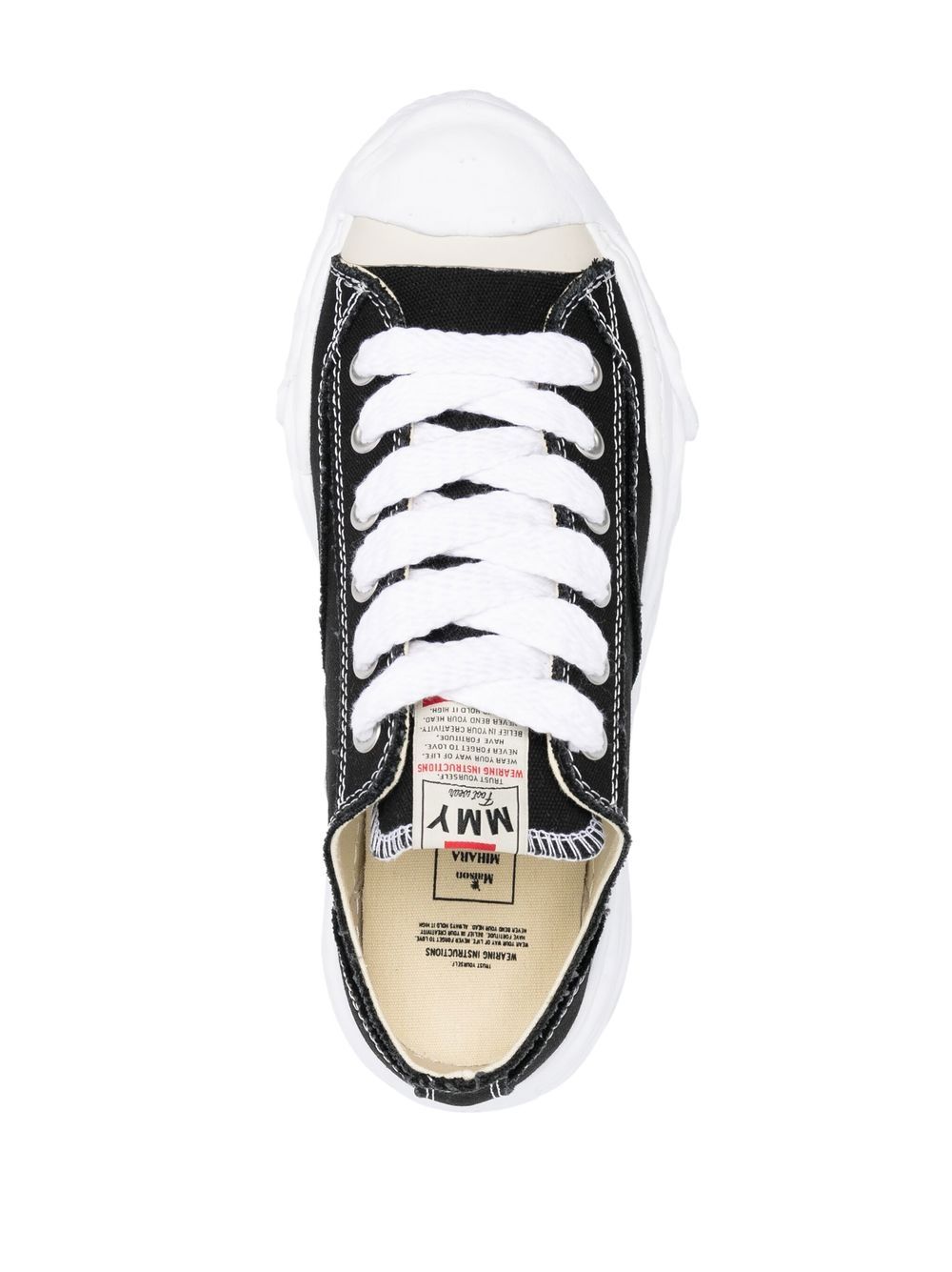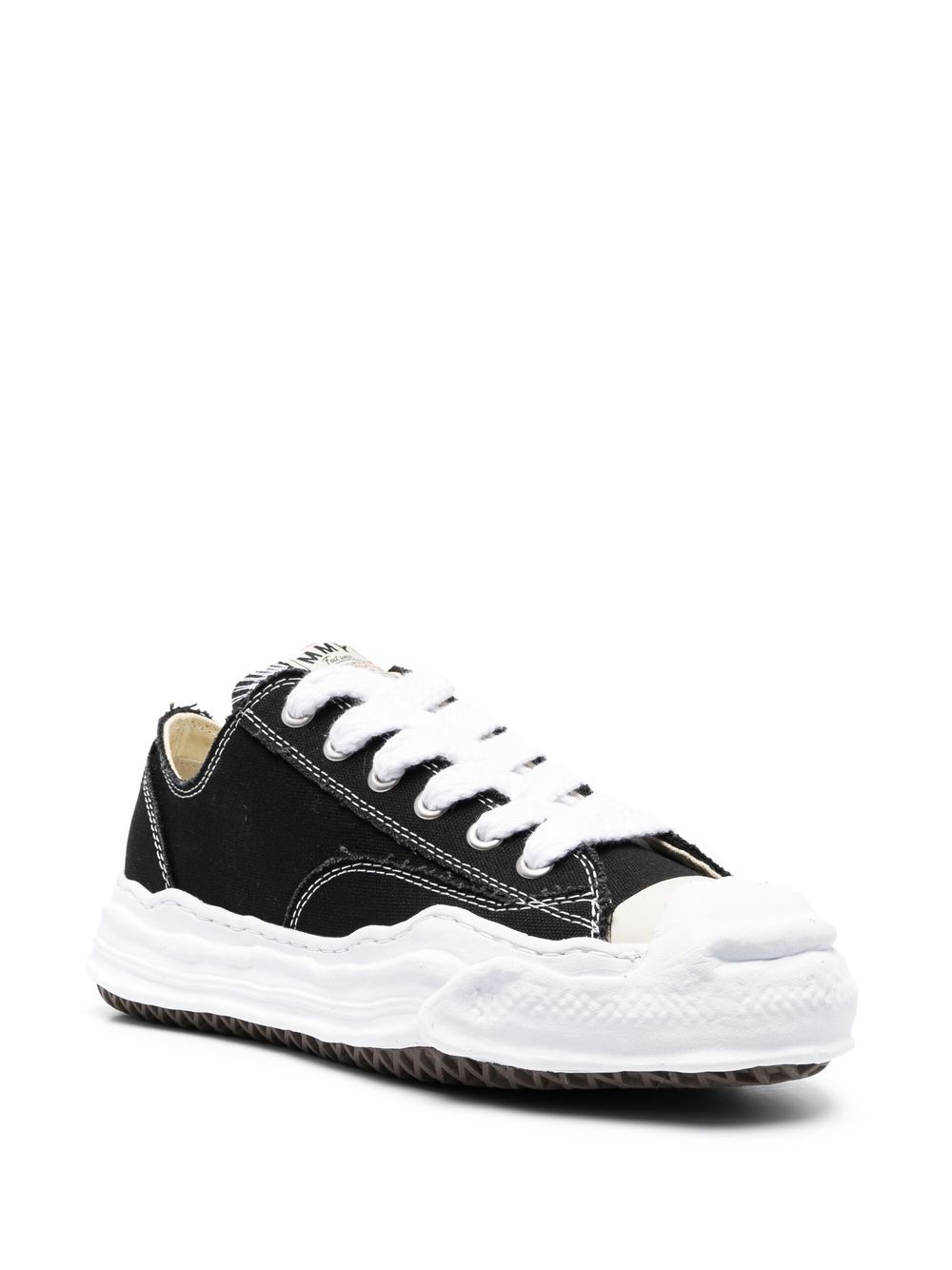 Black Hank Low sneakers from Maison Mihara Yasuhiro in fabric with white round toe, front closure with wide laces, logo label on the tongue and distinctive white flat rubber sole.