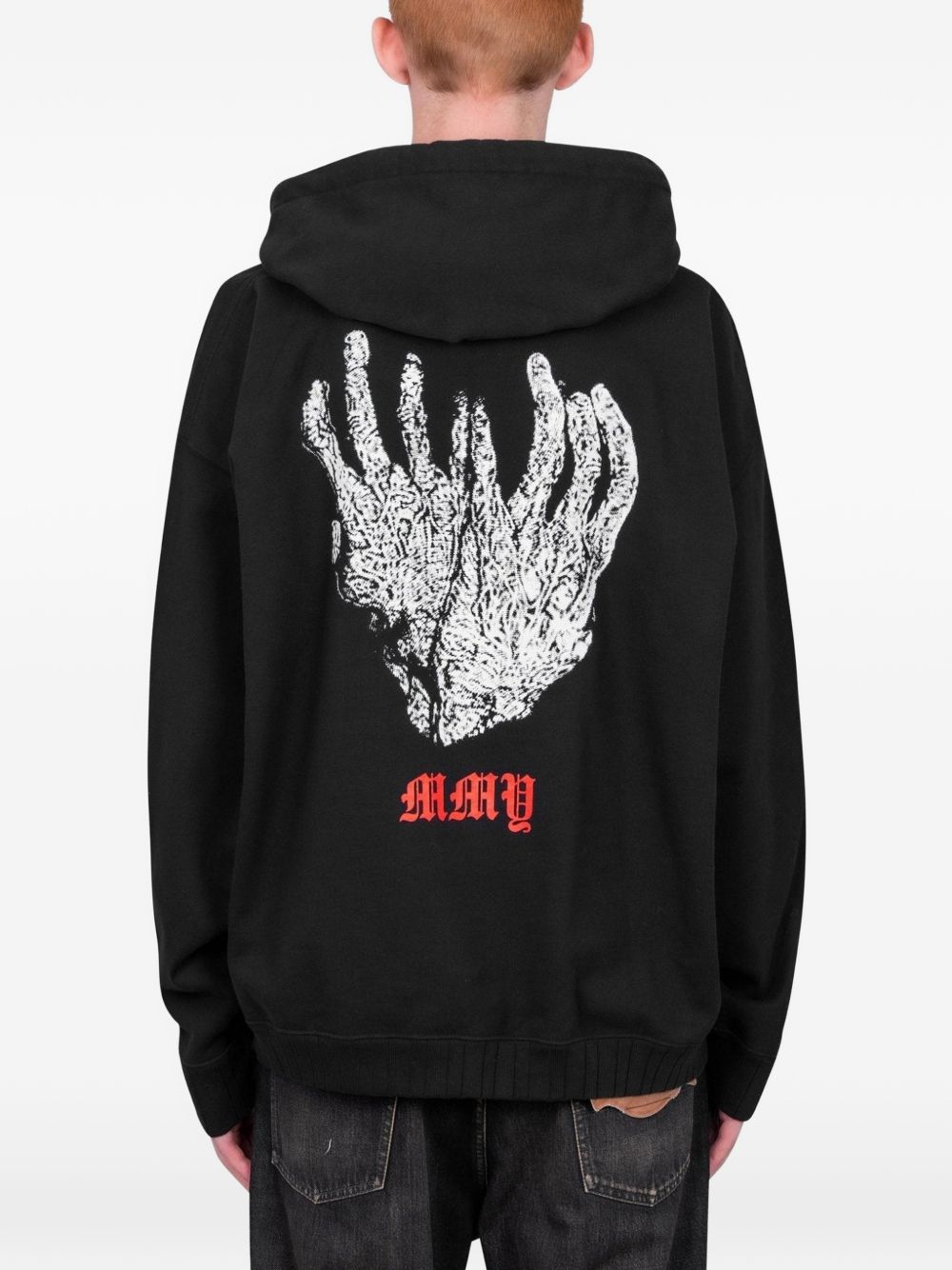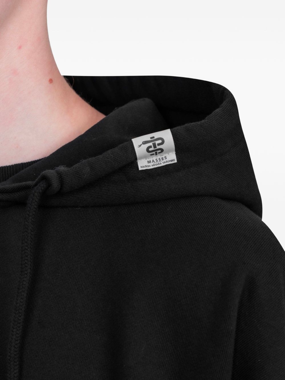 Black hoodie by Maison Mihara Yasuhiro in cotton with drawstring hood, front kangaroo pocket, logo label, ribbed hem.