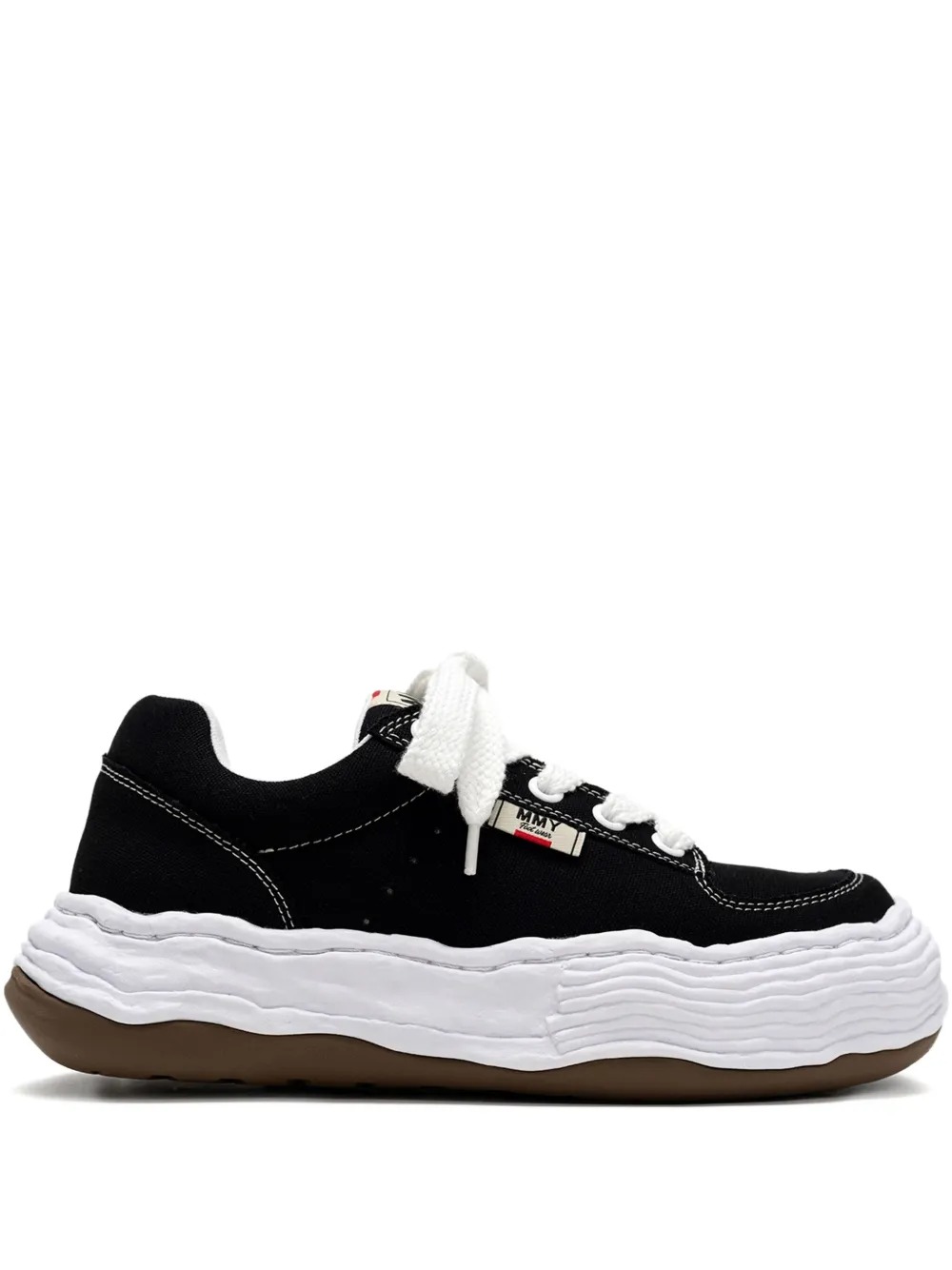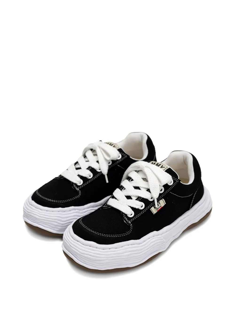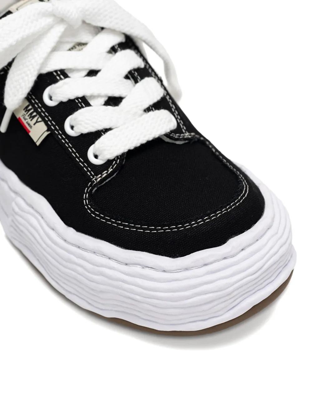 Black Oliver sneakers by Maison Mihara Yasuhiro in fabric with a white round toe, front closure with wide laces, logo label on the tongue, and rubber sole.