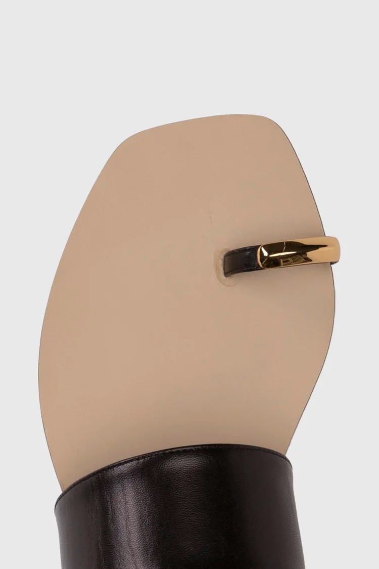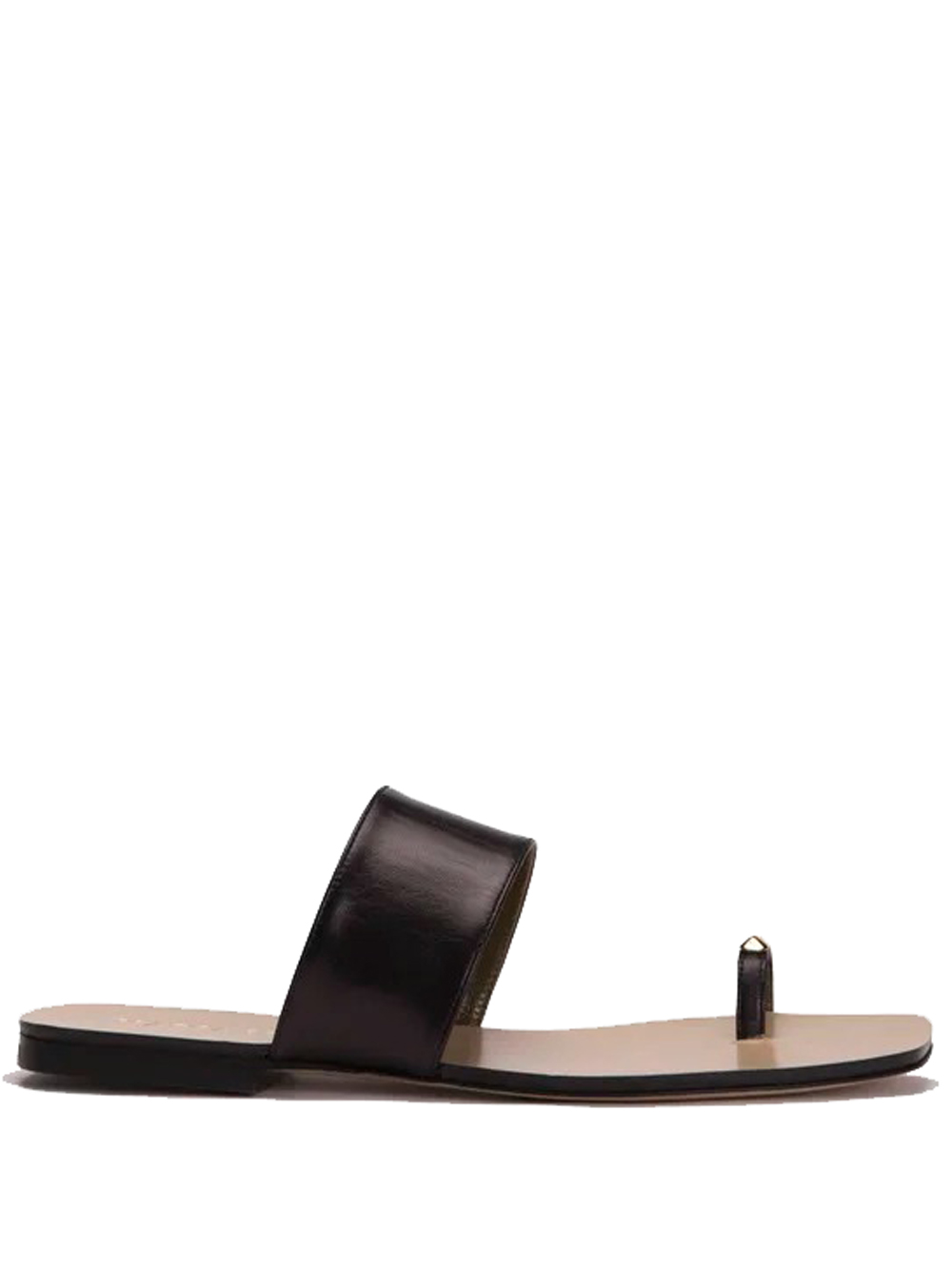 Maria Luca Oleandra Capri black leather sandals, slip-on style, with a gold-tone metal strap across the toe and a flat sole.