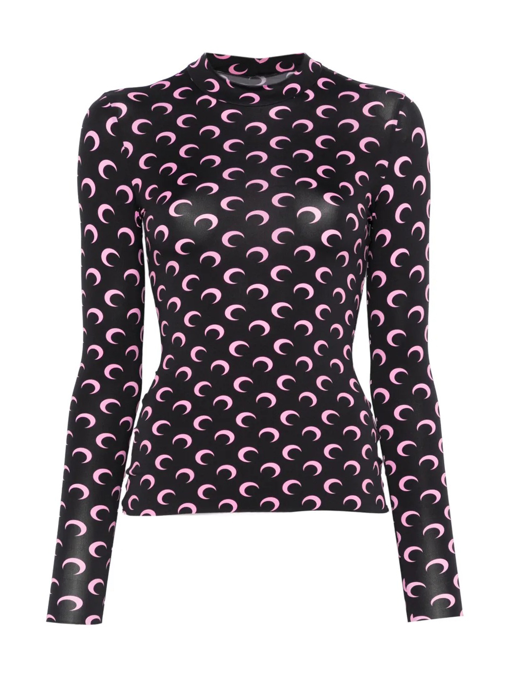 Black and pink top by Marine Serre in polyamide with a high neck, long sleeves, all-over print, and straight hem.