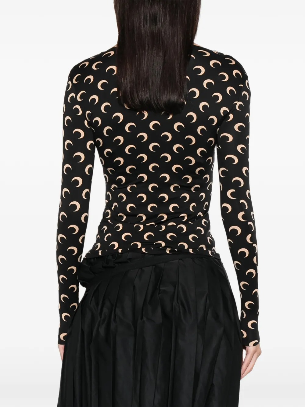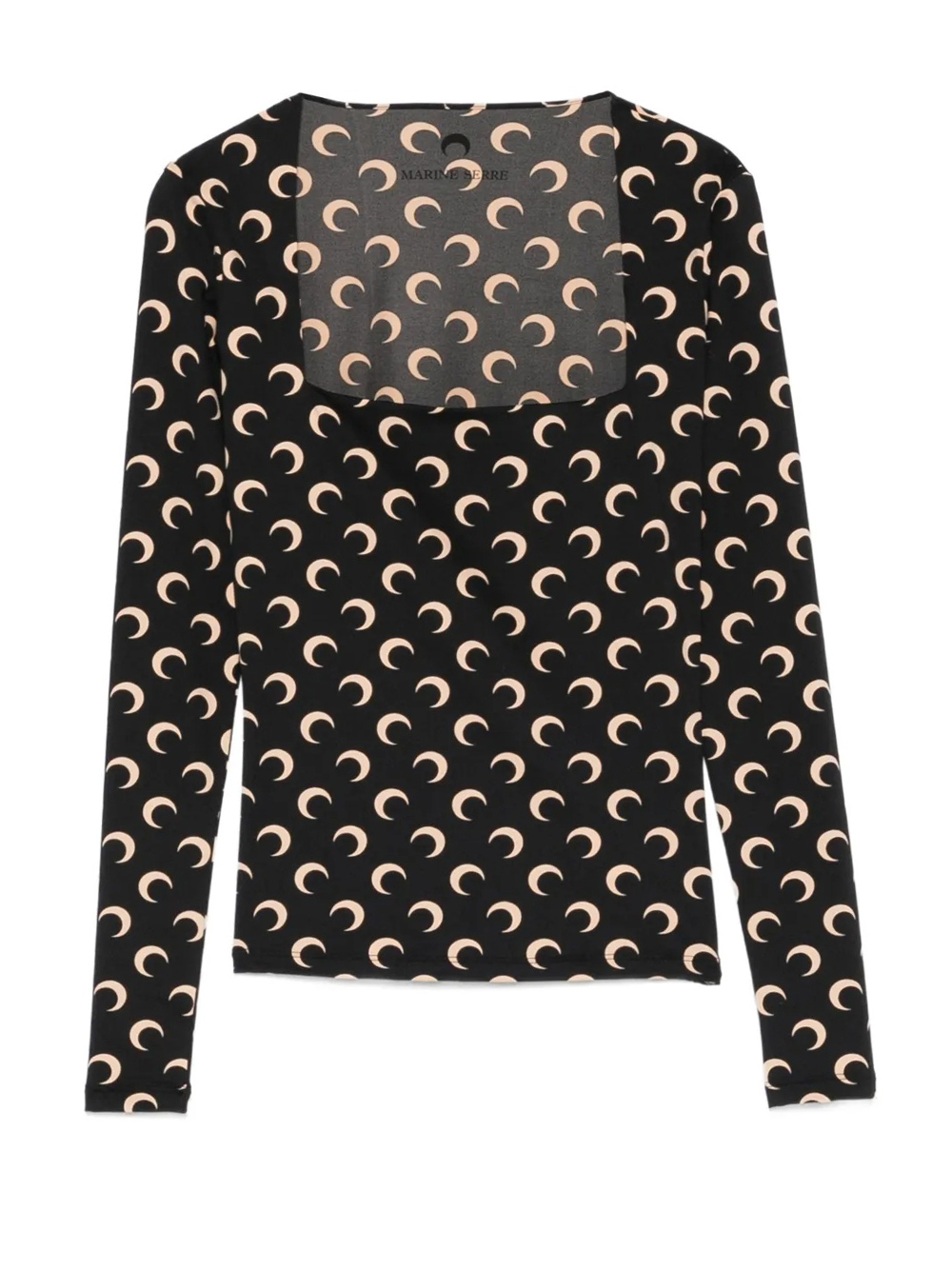 Black and tan top by Marine Serre in polyamide with Moon print, square neckline, and long sleeves.