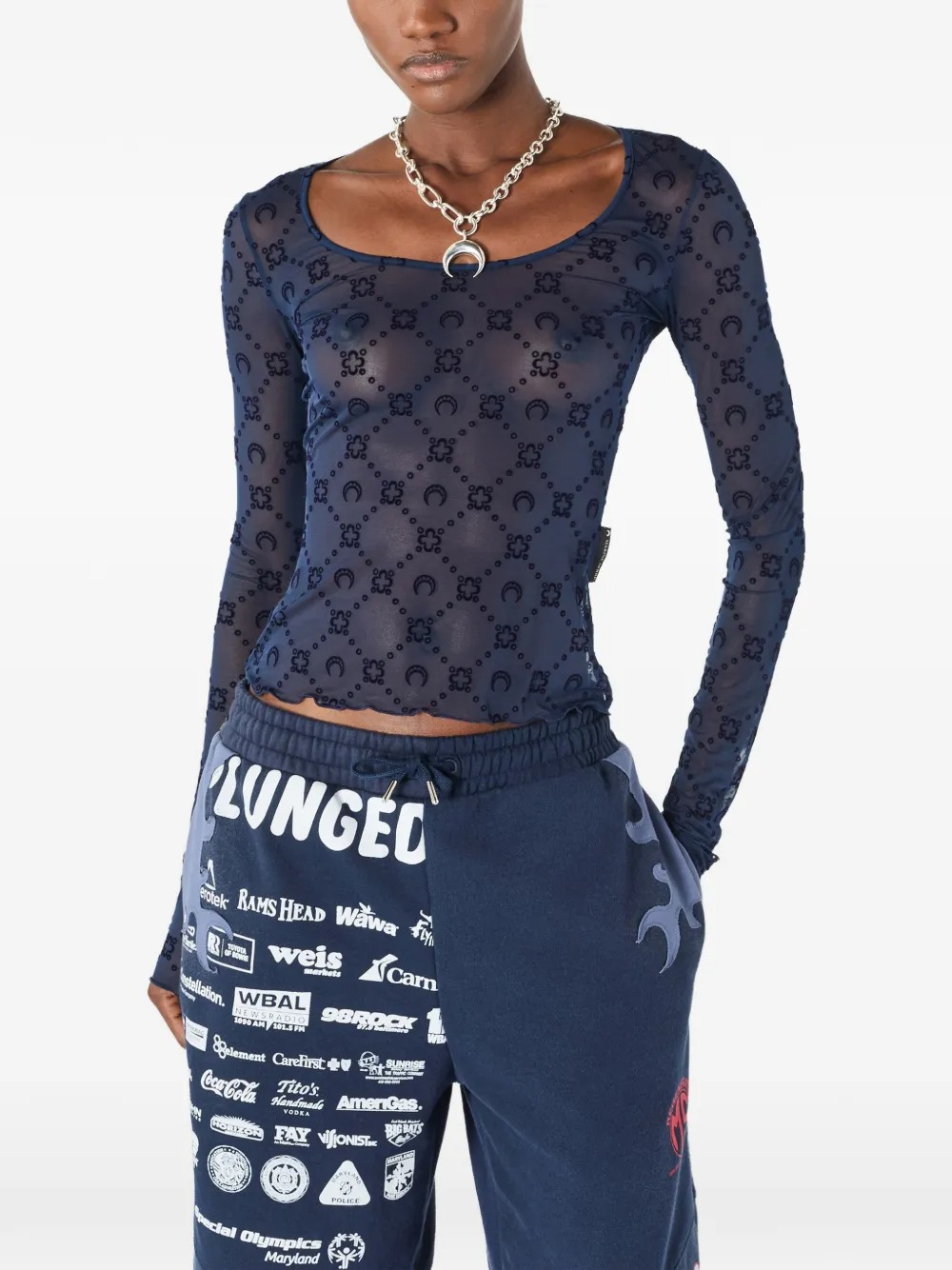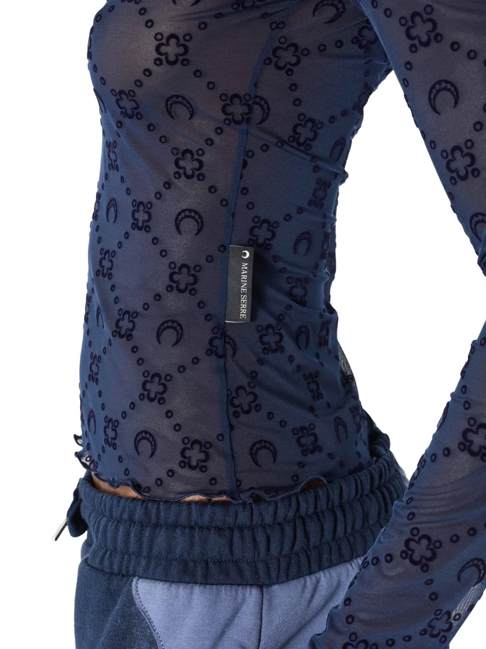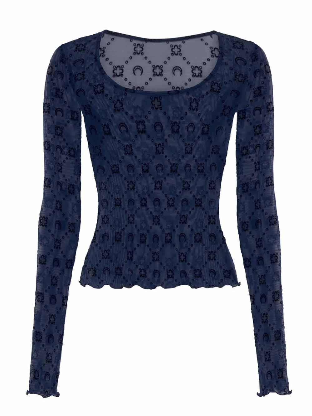 Navy top by Marine Serre in polyamide with a crew neck, long sleeves, an all-over print, and a ruffled hem.