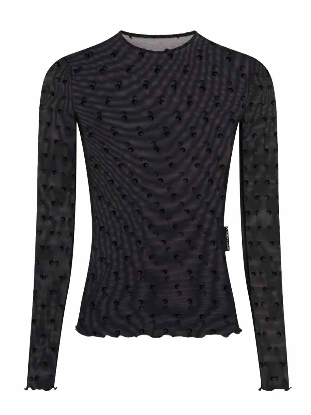 Black top by Merine Serra in silk and nylon, featuring a sheer black mesh with an all-over moon pattern, a crew neck, long sleeves, and a scalloped hem; it features a logo patch on the side.